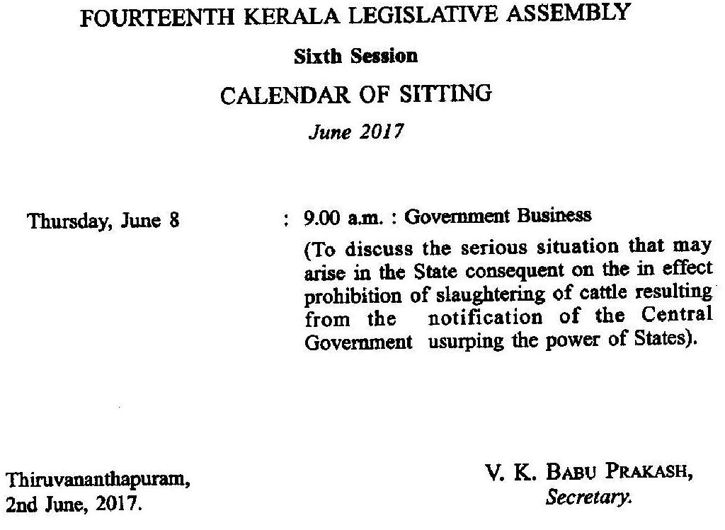 இந்நிலையில், மத்திய அரசின் இந்த உத்தரவு குறித்து விவாதிப்பதற்காக கேரள சட்டசபையின் சிறப்பு கூட்டம் திருவனந்தபுரத்தில் இன்று (08.06.2017) காலை 9 மணிக்கு நடைப்பெற்றது.