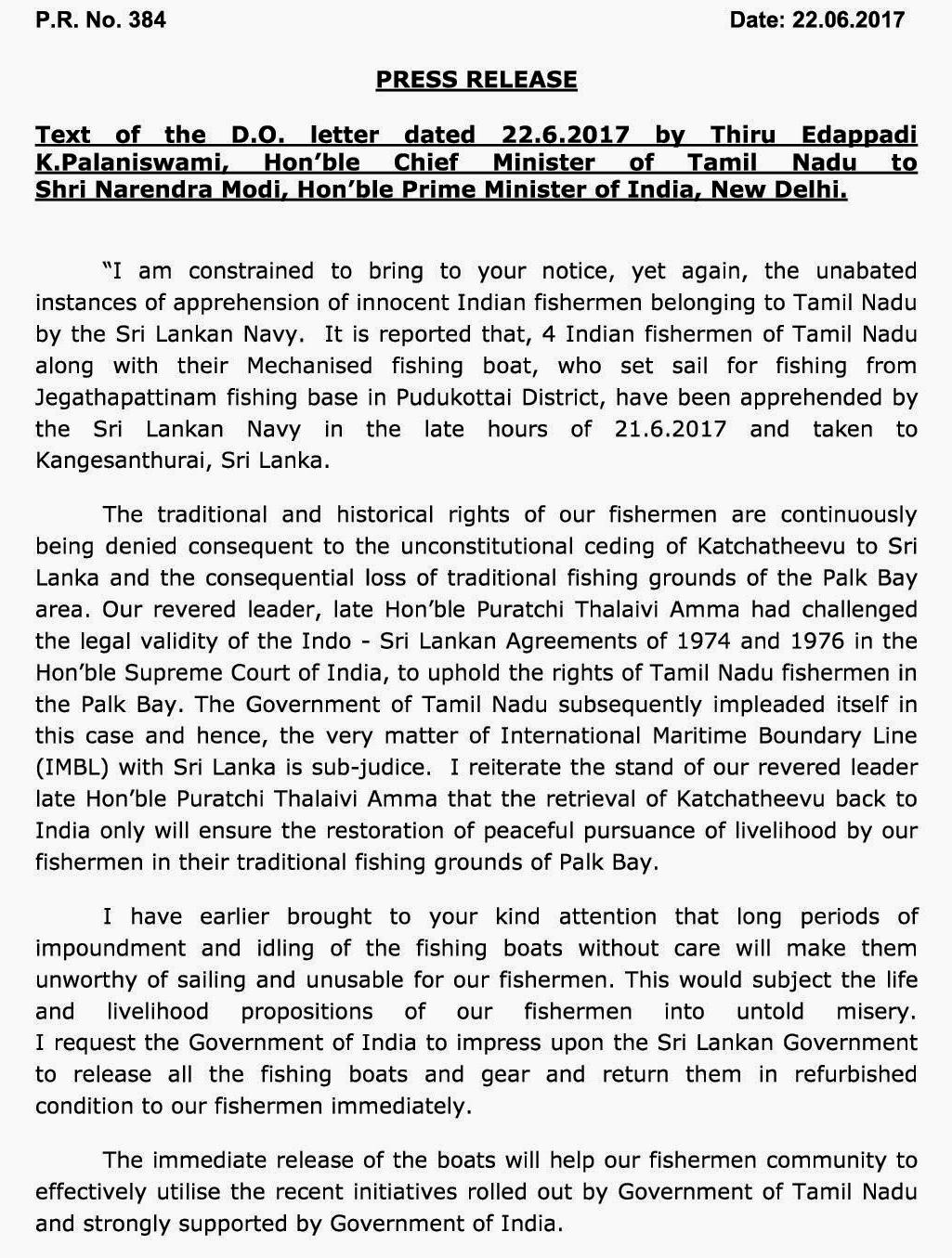 பிரதமர் நரேந்திர மோதிக்கு, தமிழக முதலமைச்சர் கே.பழனிசாமி இன்று எழுதியுள்ள கடிதத்தில், புதுக்கோட்டை மாவட்டம் ஜெகதாப்பட்டினத்திலிருந்து மீன் பிடிக்கச் சென்ற 4 மீனவர்களை கடந்த 21-ம் தேதியன்று இலங்கைக் கடற்படையினர் கைது செய்து, இலங்கையில் உள்ள காங்கேசன் துறைமுகத்திற்கு கொண்டு சென்றுள்ளனர்.