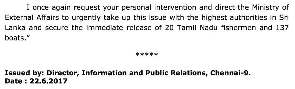 இவர்களையும் சேர்த்து, இலங்கை சிறையில் உள்ள 20 தமிழக மீனவர்களையும், 137 மீன்பிடி படகுகளையும் உடனடியாக விடுவிக்க பிரதமர், வெளியுறவு அமைச்சகத்திற்கு உத்தரவிட வேண்டும்.