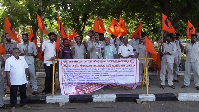 பாரதீய மஸ்தூர் சங்க மாவட்ட தலைவர் கோபாலகிருஷ்ணன் தலைமையில் நடைபெற்ற இந்த ஆர்பாட்டத்தில்,
