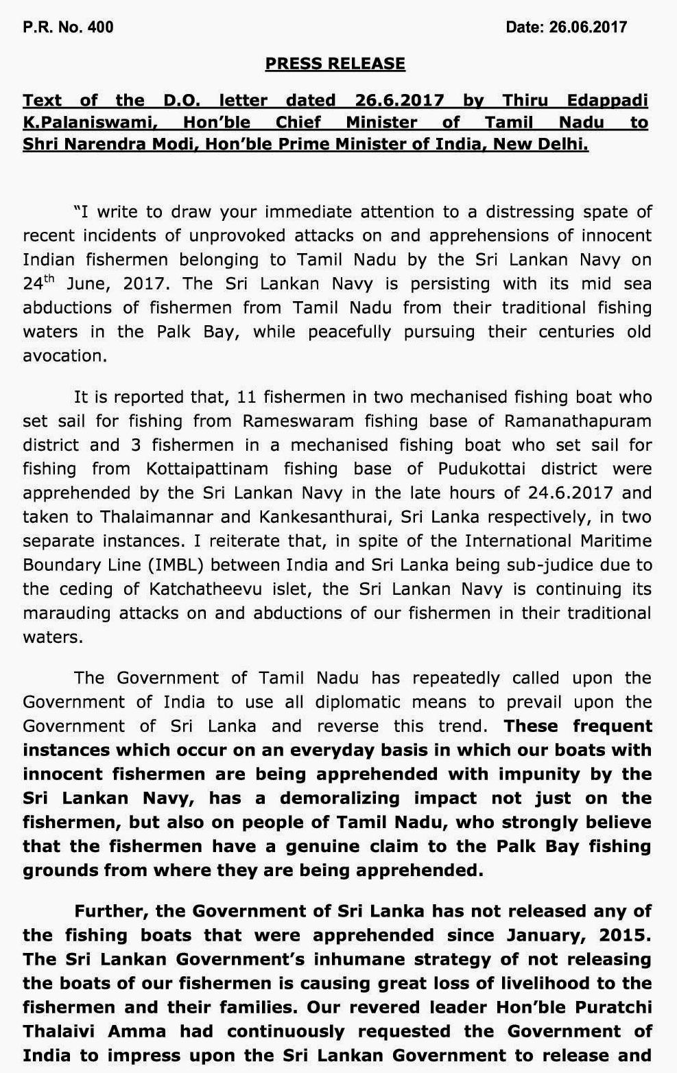 தமிழக முதலமைச்சர் கே.பழனிசாமி, பிரதமர் நரேந்திர மோதிக்கு இன்று எழுதிய கடிதத்தில், ராமேஸ்வரத்திலிருந்து 2 இயந்திர படகுகளில் மீன்பிடிக்க சென்ற 11 மீனவர்களையும், புதுக்கோட்டை மாவட்டம் கோட்டைப்பட்டினத்திலிருந்து ஒரு இயந்திரப் படகில் கடலுக்கு சென்ற 3 மீனவர்களையும், நேற்று முன்தினம், இலங்கை கடற்படை முறையே தலைமன்னாருக்கும், காங்கேசன்துறைக்கும் கொண்டு சென்றுள்ளனர்.