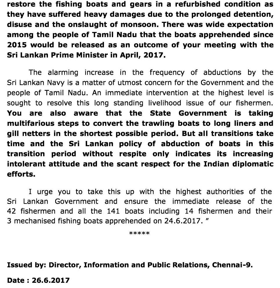 மேலும், இலங்கை கடற்படை பிடித்து வைத்துள்ள தமிழக மீனவர்களின் படகுகள் நீண்ட காலமாக பயன்படுத்தப்படாமல் மழை–வெயிலில் காய்ந்து வருவதால் சேதமடைந்துள்ளது. அவற்றை விடுவித்து, பழுது நீக்கி ஒப்படைக்க வேண்டும் என்று, மறைந்த மாண்புமிகு அம்மா தொடர்ந்து வலியுறுத்தி வந்துள்ளதையும் முதலமைச்சர் நினைவுப்படுத்தியுள்ளார்.