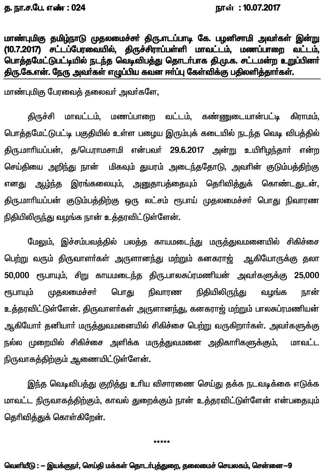 Home|News|திருச்சி, மணப்பாறை, பொத்தமேட்டுபட்டியில் பழைய இரும்புக் கடையில் நடந்த வெடி விபத்து குறித்து தமிழ்நாடு முதலமைச்சர் கே. பழனிசாமி விளக்கம். -ஆர்.திவ்யா.