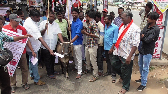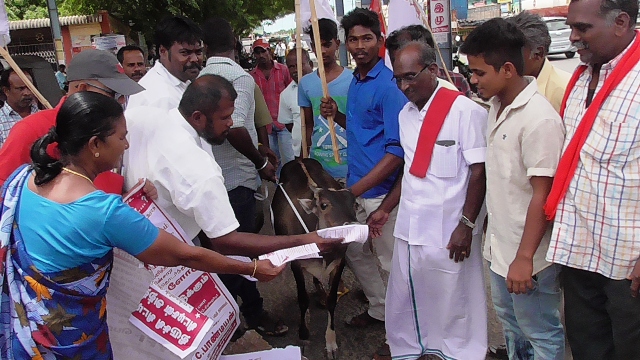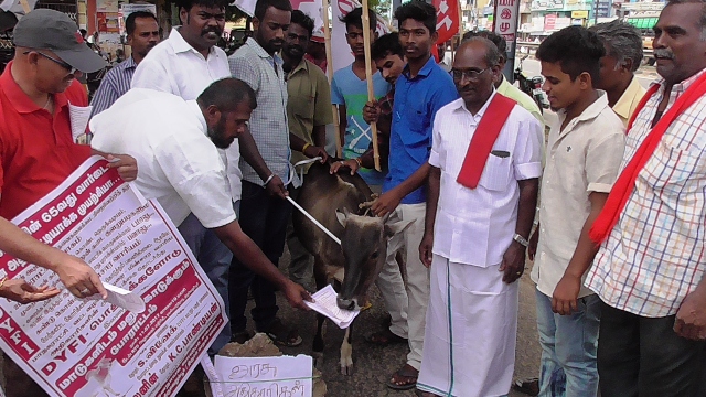 அதேப்போல் பொது வினியோக துறையில் செல்வபுரத்தில் 2 ஆயிரம் குடும்ப அட்டைக்கு ஒரு நியாய விலை கடையே உள்ளது. இதனால் பொது மக்கள் சிரமம் அடைகின்றனர். அதனால் அந்த கடையை இரண்டாக பிரிக்க வேண்டும். அனைவருக்கும் பாரபட்சமின்றி உணவு பொருட்கள் வழங்க வேண்டும். பதுக்கல் செய்யகூடாது. தேவையில்லாத சோப்பு, ரவை போன்ற பொருட்களை வாங்கும் படி கடை ஊழியர் நிர்ப்பந்திக்க கூடாது உள்ளிட்ட கோரிக்கைகளை வலியுறுத்தி மாடுக்கு மனு கொடுக்கும் நுதனப் போராட்டத்தில் இந்திய ஜனநாயக வாலிபர் சங்கத்தினர் ஈடுப்பட்டனர்.