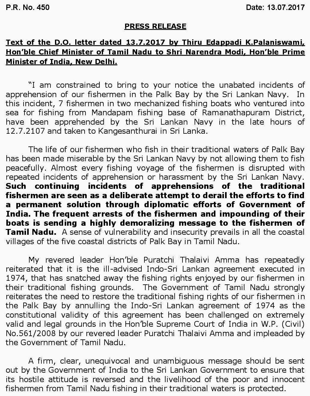 தமிழக முதலமைச்சர் கே. பழனிசாமி, பிரதமர் நரேந்திர மோதிக்கு இன்று எழுதியுள்ள கடிதத்தில், ராமநாதபுரம் மாவட்டம், மண்டபம் பகுதியைச் சேர்ந்த 7 மீனவர்கள் பாக். நீரிணைப் பகுதியில் நேற்று இயந்திரப் படகு மூலம் மீன்பிடித்துக் கொண்டிருந்தபோது, இலங்கை கடற்படையினர் அவர்களை சிறைபிடித்து, காங்கேசன்துறைக்கு கொண்டுசென்றுள்ளனர்.