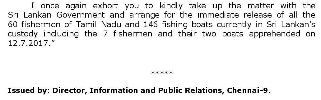 இலங்கை கடற்படையினரின் இதுபோன்ற தொடர் அத்துமீறல்களை நிறுத்த, தூதரக வாயிலாக உடனடி நடவடிக்கை மேற்கொள்ள வேண்டும். ராமநாதபுரம் மாவட்ட மீனவர்கள் 7 பேர் உட்பட தற்போது இலங்கை சிறையில் உள்ள 60 மீனவர்களையும், இலங்கை வசம் உள்ள 146 மீன் பிடி படகுகளையும் மீட்க நடவடிக்கை எடுக்க வேண்டும் என, தமிழக முதலமைச்சர் கே. பழனிசாமி, பிரதமர் நரேந்திர மோதிக்கு எழுதியுள்ள கடிதத்தில் குறிப்பிட்டுள்ளார்.