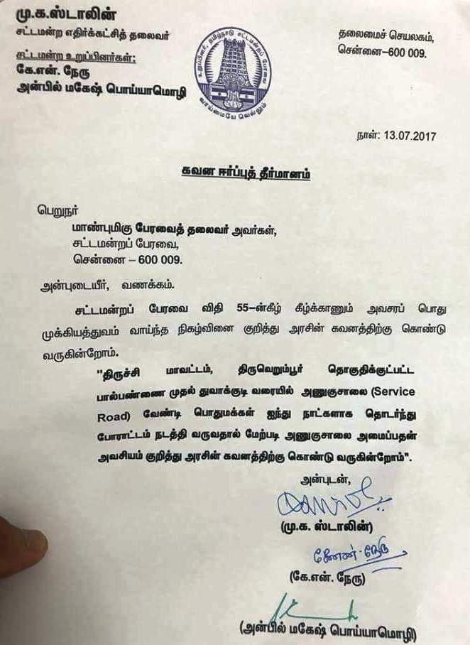 திருச்சி-தஞ்சை தேசிய நெடுஞ்சாலையில் அணுகு சாலை (சர்வீஸ் ரோடு) அமைக்க வலியுறுத்தி தி.மு.க. சார்பில் கவன ஈர்ப்புத் தீர்மானம்!