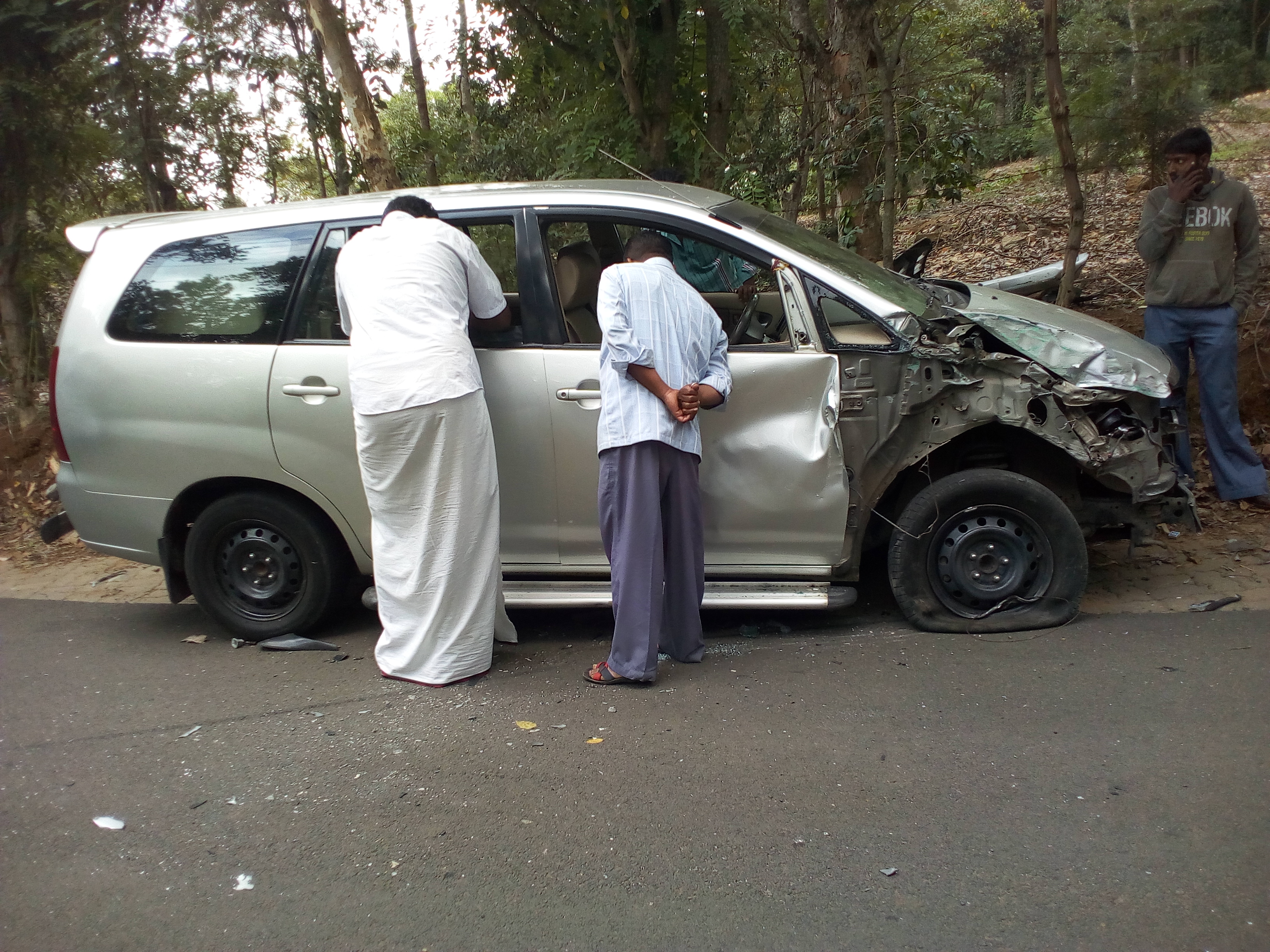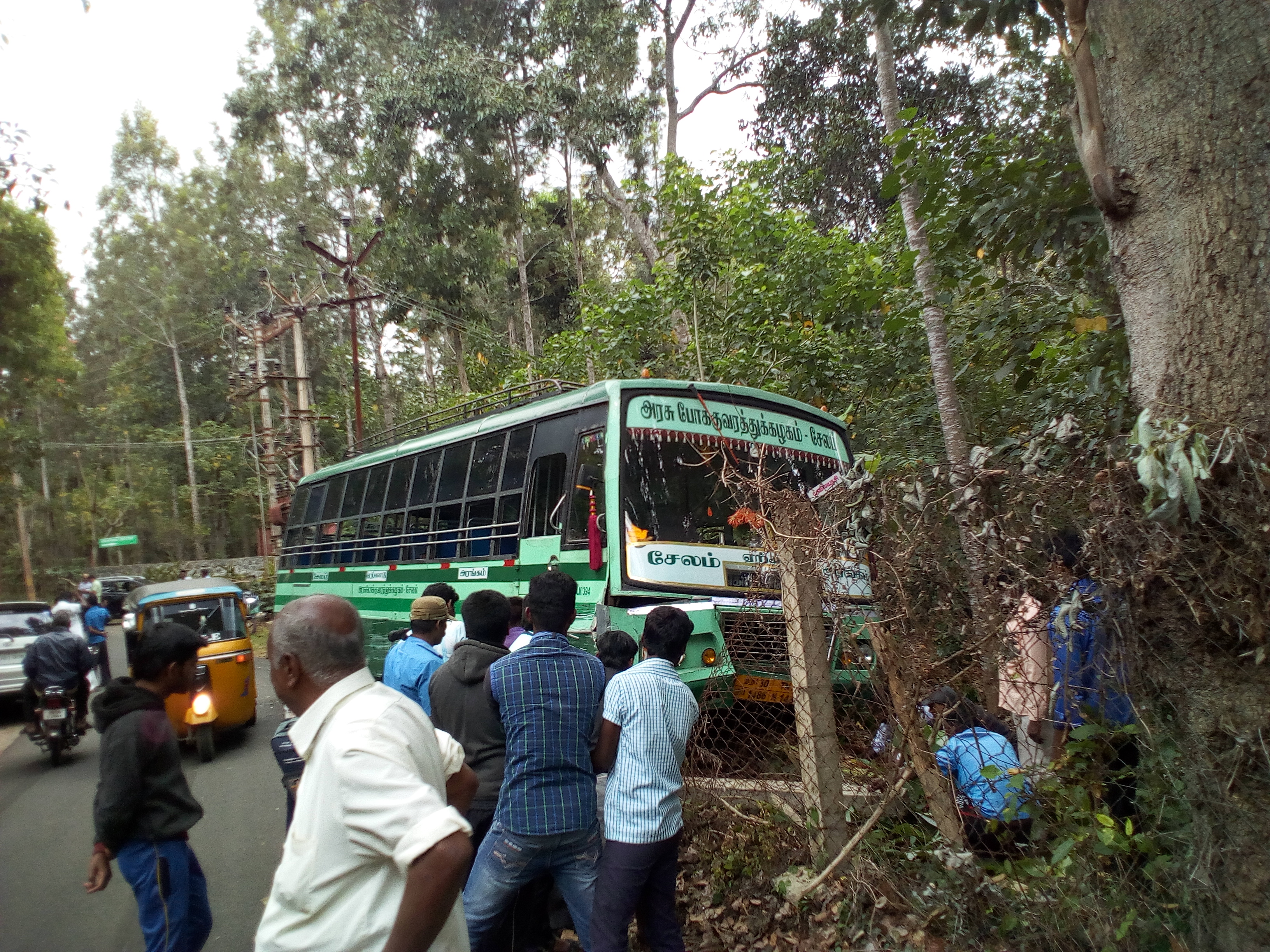 அந்த கார் அரசு பேருந்தின் முன்புறம் மோதியது. இதனால் பேருந்து சாலையோரத்தில் உள்ள மின்சார  டிரான்ஸ் பார்மர் மீது மோதும்படி சென்றது. உடனடியாக ஓட்டுனர் சின்ராஜ் பேருந்தை அங்கிருந்த காப்பித்தோட்டத்திற்கு திருப்பி இறக்கினார். இதனால் பேருந்து டிரான்ஸ் பார்மர் மோதாமல் பெரும் விபத்து தவிர்க்கப்பட்டது. இதனால் 49 பயணிகள் உயிர் தப்பித்தனர்.