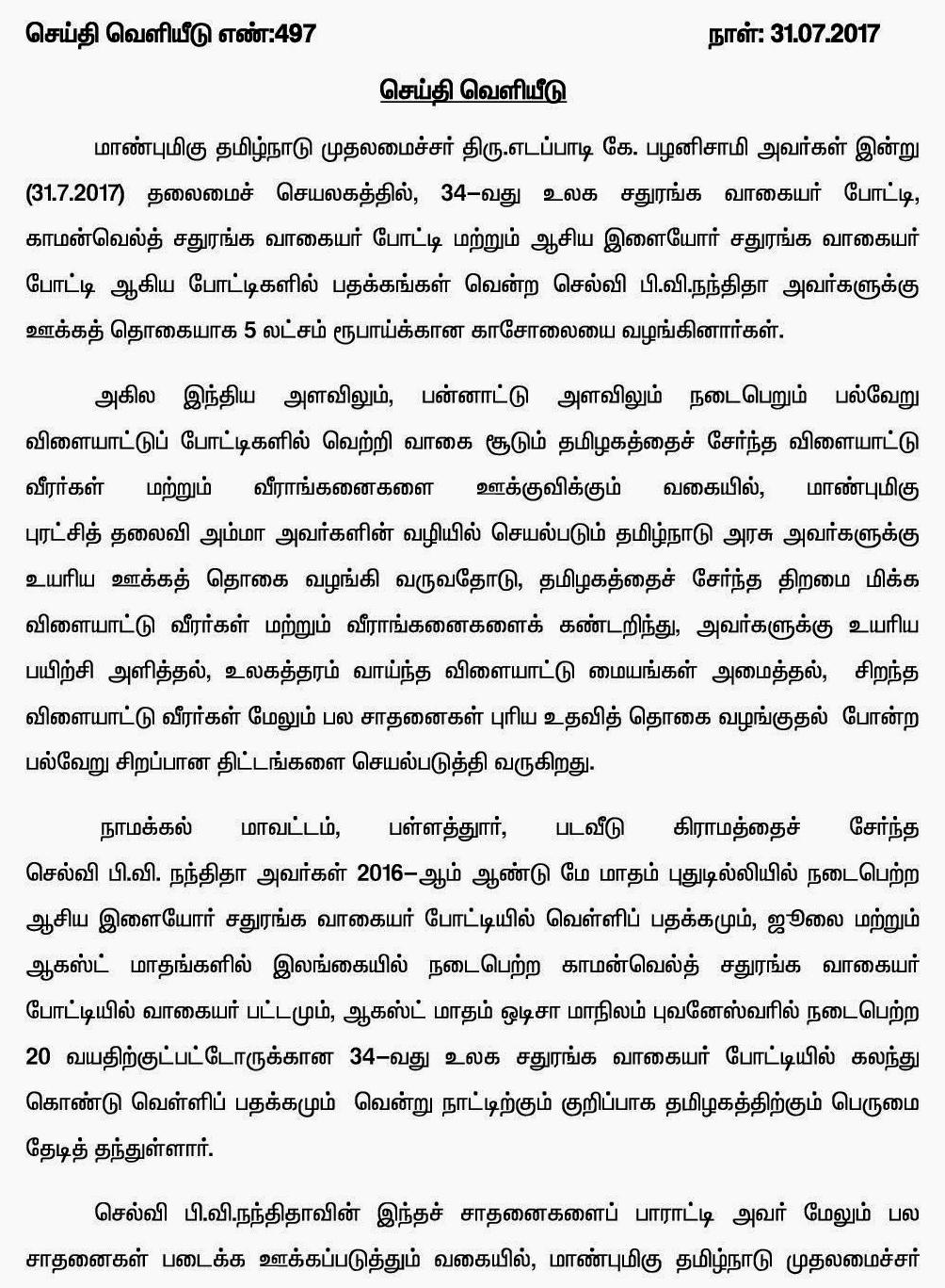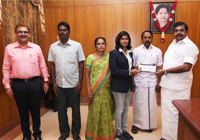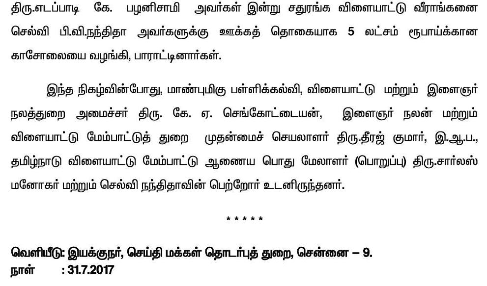 சதுரங்க விளையாட்டு வீராங்கனை செல்வி பி.வி.நந்திதாவுக்கு ஊக்கத் தொகையாக 5 லட்சம் ரூபாய்க்கான காசோலையை தமிழ்நாடு முதலமைச்சர் கே.பழனிசாமி வழங்கினார்.
