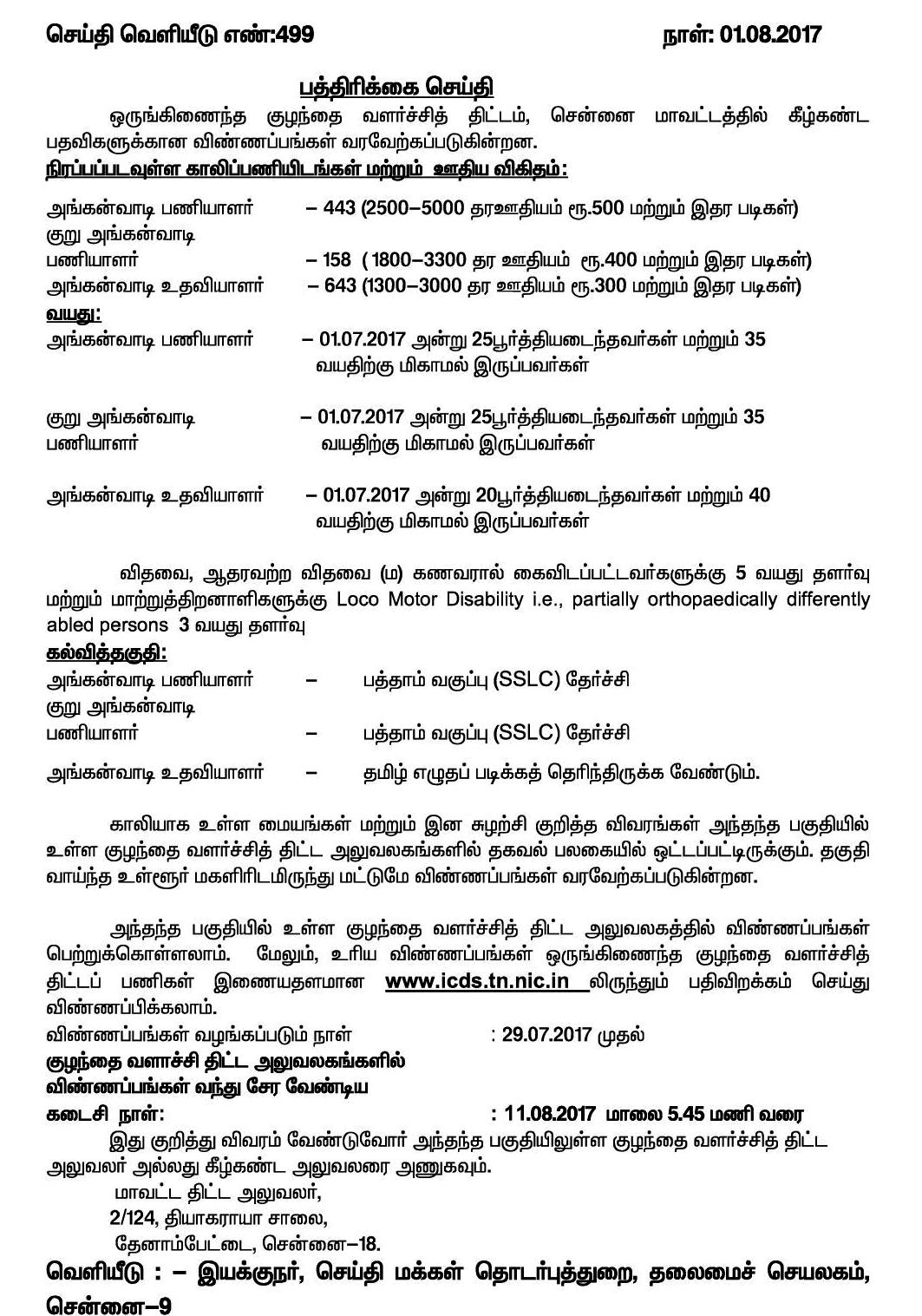 சென்னை மாவட்டத்தில் அங்கன்வாடி பணியாளர் பதவிகளுக்கான விண்ணப்பங்கள் வரவேற்கப்படுகின்றன.