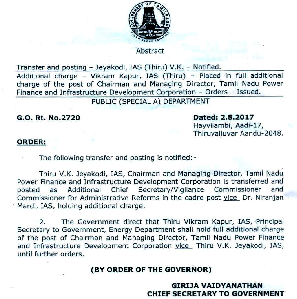 லஞ்ச ஒழிப்புத்துறை ஆணையராக வி.கே.ஜெயக்கொடி நியமிக்கப்பட்டுள்ளார். வி.கே.ஜெயக்கொடி வகித்து வந்த எரிசக்தி நிறுவனத்தின் நிர்வாக இயக்குநர் பொறுப்பை விக்ரம் கபூர் கூடுதலாக கவனிப்பார் என்று அறிவிக்கப்பட்டுள்ளது. விக்ரம் கபூர் தற்போது எரி சக்தித் துறைச் செயலாளராக உள்ளார்.