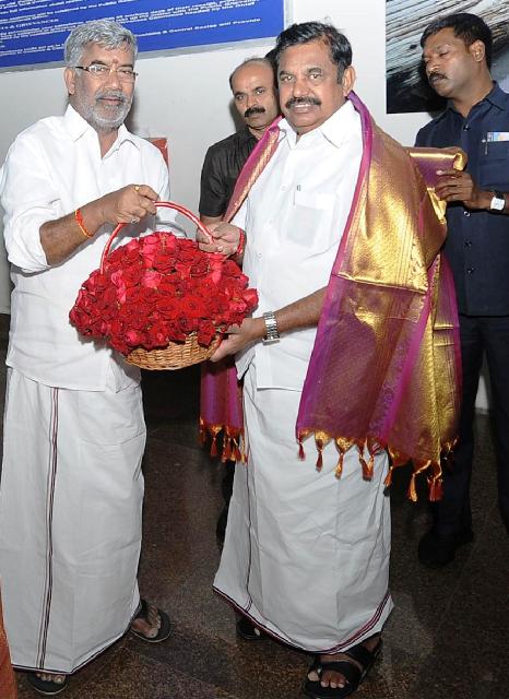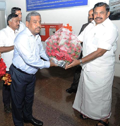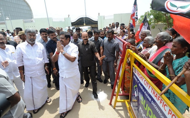 திருச்சி விமான நிலையத்தில் திருச்சி மாவட்ட ஆட்சித் தலைவர் ராஜாமணி, அமைச்சர்கள் வளர்மதி, வெல்லமண்டி நடராஜன் மற்றும் அ.தி.மு.க.வினர் மேள, தாளங்களுடன் உற்சாக வரவேற்பு அளித்தனர்.