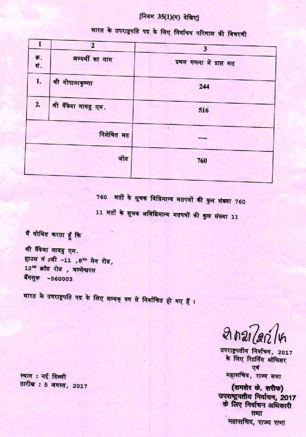 இத்தேர்தலில், வெங்கய்யா நாயுடு வெற்றி பெற்றுள்ளார். வெங்கய்யா நாயுடுக்கு 516 வாக்குகளும், கோபால கிருஷ்ண காந்திக்கு 244 வாக்குகளும் கிடைத்துள்ளது.