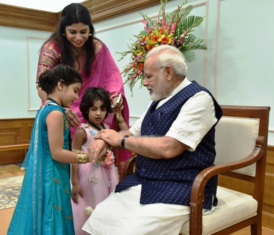 புது தில்லியில் இன்று (ஆகஸ்ட் 07, 2017) நடைப்பெற்ற ரக்ஷா பந்தன் நிகழ்ச்சியில், பிரதமர் நரேந்திர மோதியின் மணிக்கட்டில் ‘ராக்கி’ எனும் புனிதக்கயிற்றை கட்டி குழந்தைகள் தங்கள் மகிழ்ச்சியை வெளிப்படுத்தினார்கள்.