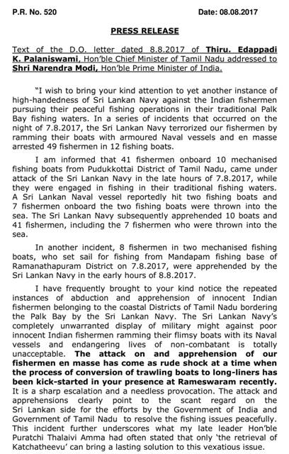 பிரதமர் நரேந்திர மோதிக்கு, தமிழக முதலமைச்சர் கே. பழனிசாமி எழுதியுள்ள கடிதத்தில், புதுக்கோட்டை மாவட்டத்தைச் சேர்ந்த 41 மீனவர்கள் நேற்று முன்தினம் நள்ளிரவு தங்கள் பாரம்பரிய மீன்பிடி பகுதியில் தொழிலில் ஈடுபட்டிருந்தபோது, இலங்கை கடற்படையினர் கப்பல்களை கொண்டு மோதி அவர்களை கைது செய்துள்ளனர்.