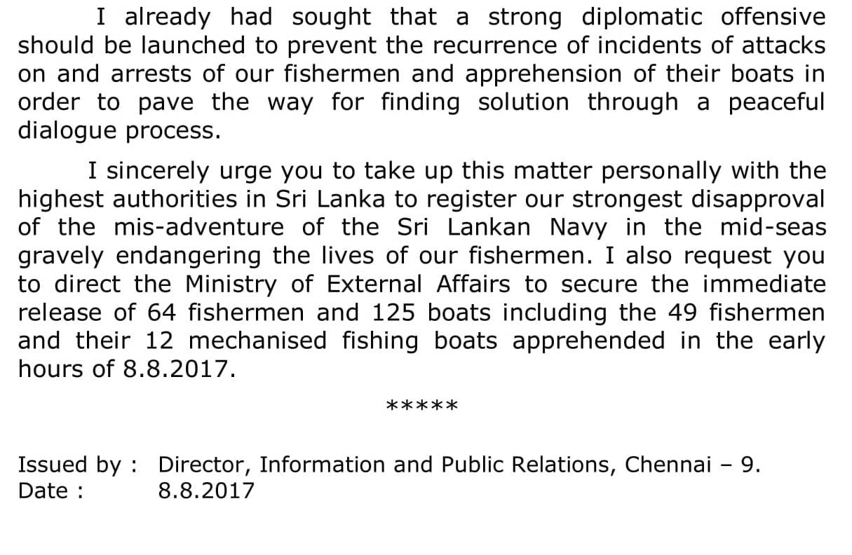 எனவே, பிரதமர் இந்த விவகாரத்தில் நேரடியாக தலையிட்டு இலங்கை அரசுக்கு, இந்தியாவின் கடும் எதிர்ப்பை தெரிவிக்க வேண்டும். பிடித்துச் செல்லப்பட்ட 49 மீனவர்கள் உள்ளிட்ட இலங்கை சிறைகளில் வாடிவரும் 64 மீனவர்களையும், அந்நாட்டில் நிறுத்தி வைக்கப்பட்டுள்ள தமிழக மீனவர்களின் 125 படகுகளையும் உடனடியாக மீட்க வெளியுறவு அமைச்சகத்துக்கு பிரதமர் உத்தரவிட வேண்டும்.