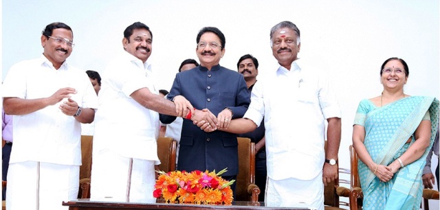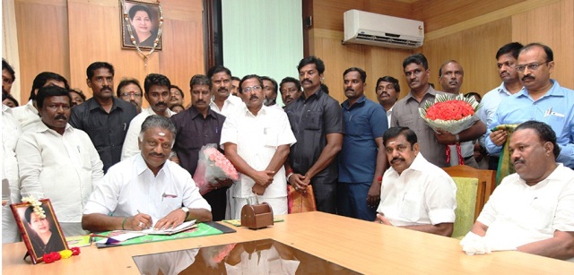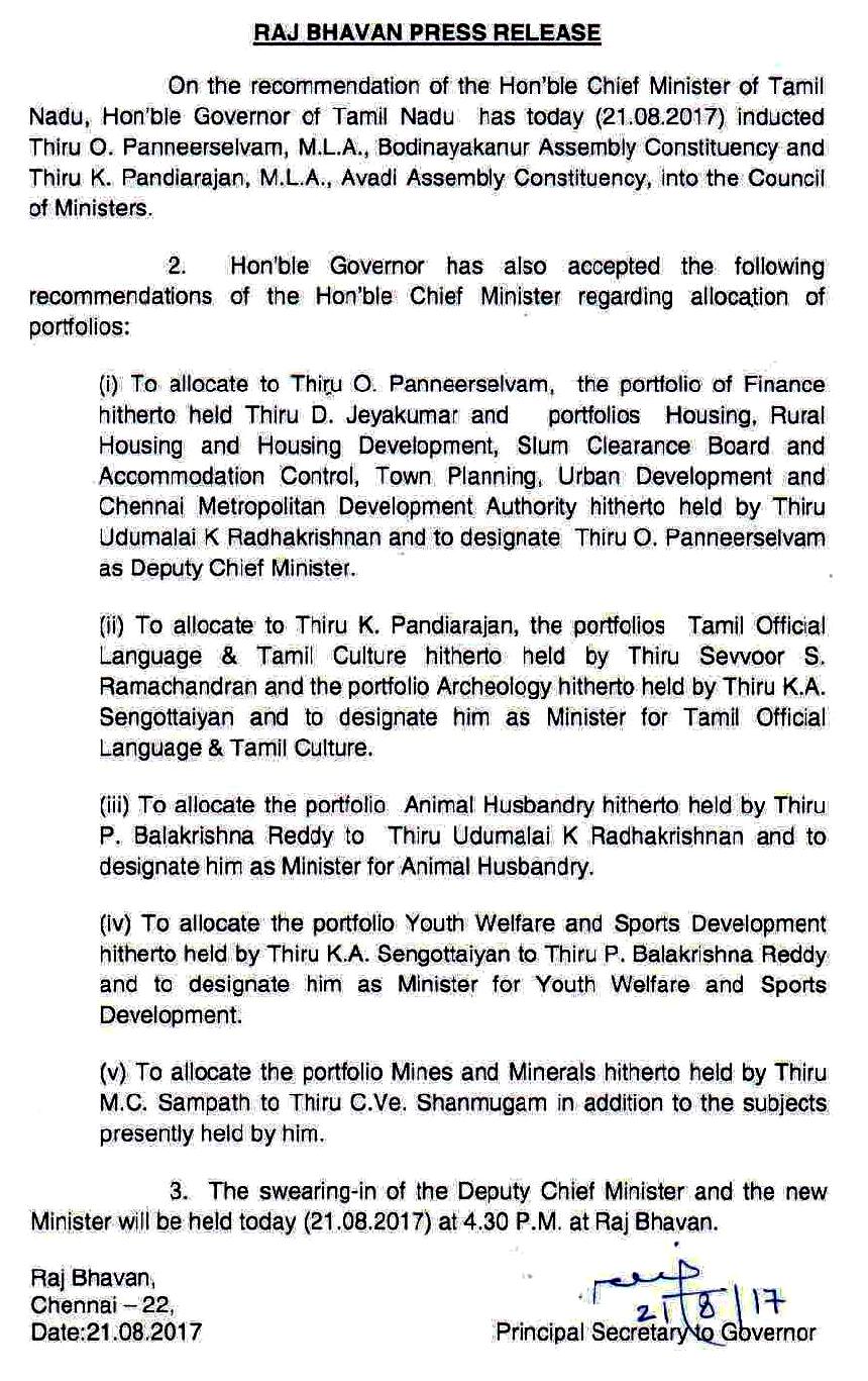 இந்நிலையில், தமிழக ஆளுனர் வித்யாசாகர் ராவ் இன்று (21.08.2017) மாலை தமிழக துணை முதலமைச்சராக ஓ.பன்னீர் செல்வத்திற்கும். அமைச்சராக மாஃபா பாண்டியராஜனுக்கும் பதவி பிரமாணம் செய்து வைத்தார்.