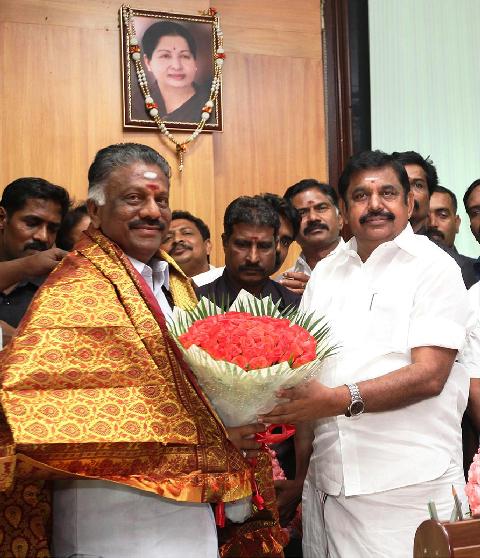 அ.இ.அ.தி.மு.க.வில் இருந்து பிரிந்திருந்த ஓ.பன்னீர் செல்வம் அணியினர் இன்று (21.08.2017) மதியம் கே.பழனிச்சாமி அணியினருடன் ஒன்றாக இணைந்தனர்.