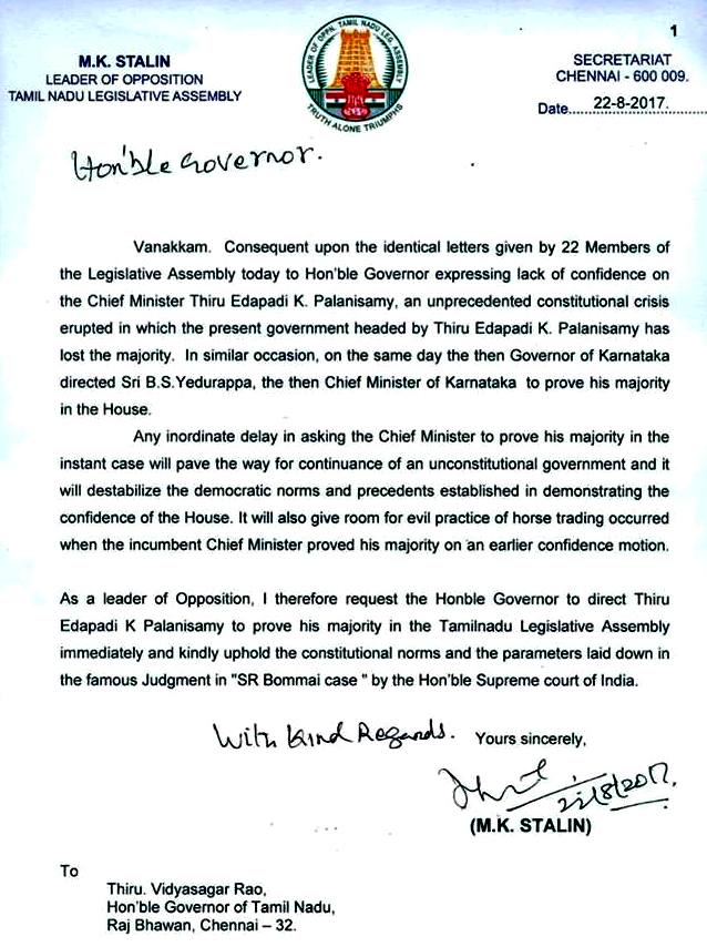 தமிழக பொறுப்பு ஆளுநர் வித்யாசாகர் ராவுக்கு, தமிழக எதிர்க்கட்சித் தலைவர் மு.க.ஸ்டாலின் எழுதிய கடிதத்தின் உண்மை நகல்!
