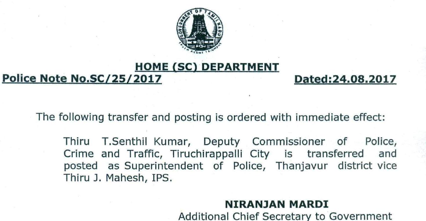 திருச்சி மாநகர காவல்துறை துணை (போக்குவரத்து & குற்றம்) ஆணையராக பணி புரிந்து வரும் டி.செந்தில்குமார், தஞ்சாவூர் மாவட்ட காவல்துறை கண்காணிப்பாளராக மாற்றம் செய்யப்பட்டுள்ளார். இதற்கான உத்தரவை தமிழக உள்துறை கூடுதல் முதன்மைச் செயலாளர் நிரஞ்சன் மார்டி பிறப்பித்துள்ளார்.