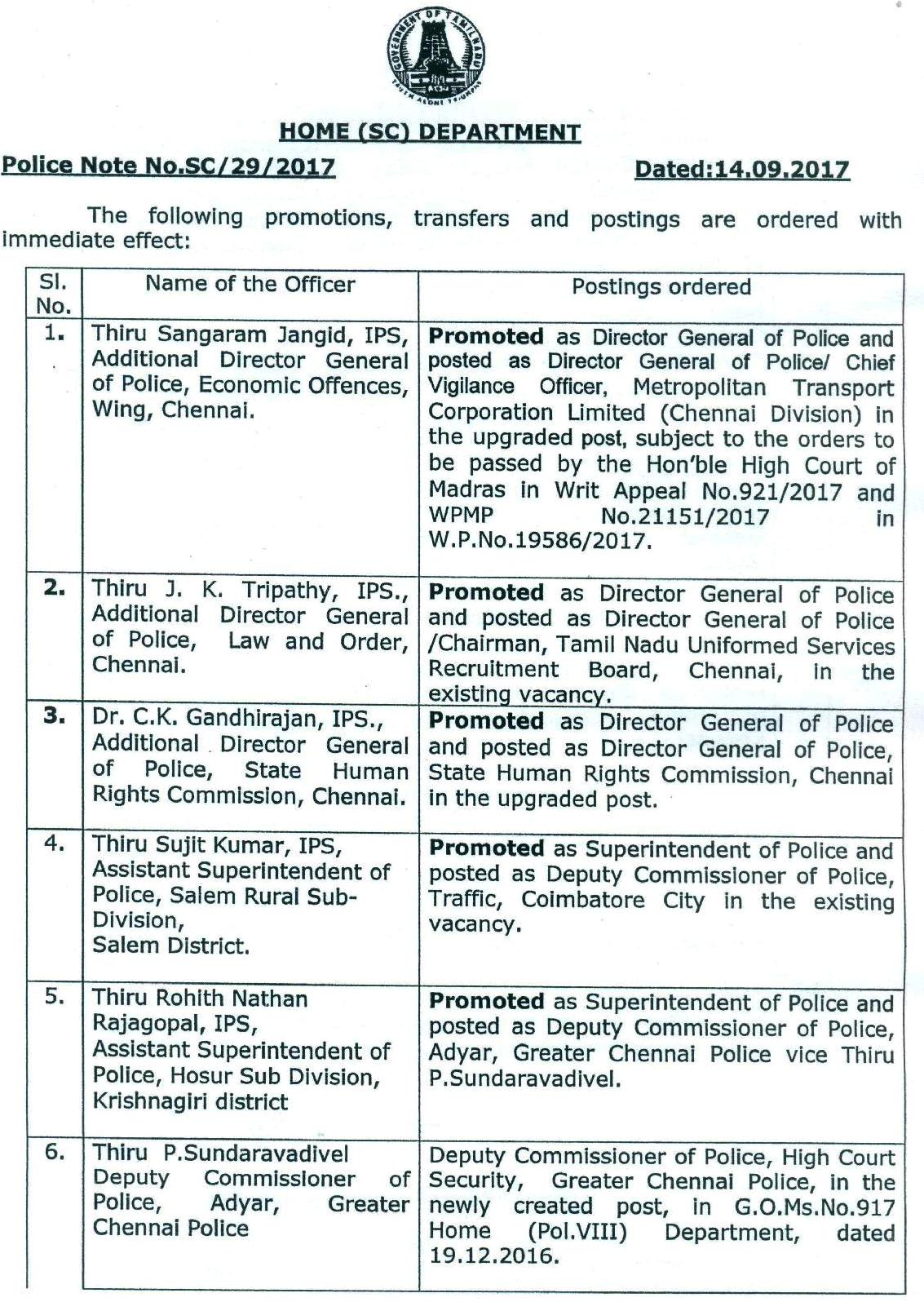 பொருளாதார குற்றப்பிரிவு கூடுதல் டி.ஜி.பி.யாக இருந்த ஜாங்கிட் ஊழல் தடுப்பு பிரிவு டி.ஜி.பி. ஆகவும், சட்டம் ஒழுங்கு ஏ.டி.ஜி.பி.,யாக இருந்து வரும் திரிபாதி சீருடை பணியாளர் தேர்வாணைய தலைவராகவும், மனித உரிமை கமிஷன் ஏ.டி.ஜி.பி.யாக இருந்து வரும் காந்திராஜன் மாநில மனித உரிமை ஆணையத்தின் தலைவராகவும் பதவி உயர்வு பெற்றுள்ளனர்.