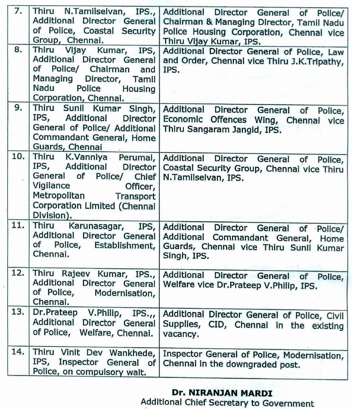 உயர்நீதிமன்றத்தின் பாதுகாப்பு துணை ஆணையராக சுந்தரவடிவேல், காவலர் நல பிரிவு ஏ.டி.ஜி.பி. ஆக ராஜிவ் குமார், ஊர்காவல்படை ஏ.டி.ஜி.பி. ஆக கருணாசாகர் கடலோர காவல் படை ஏ.டி.ஜி.பி.ஆக வன்னிய பெருமாள் பொருளாதார குற்றப்பிரிவு ஏ.டி.ஜி.பி. ஆக சுனில் குமார் சிங் ஆகியோர் பணி இடமாற்றம் செய்யப்பட்டுள்ளனர்.