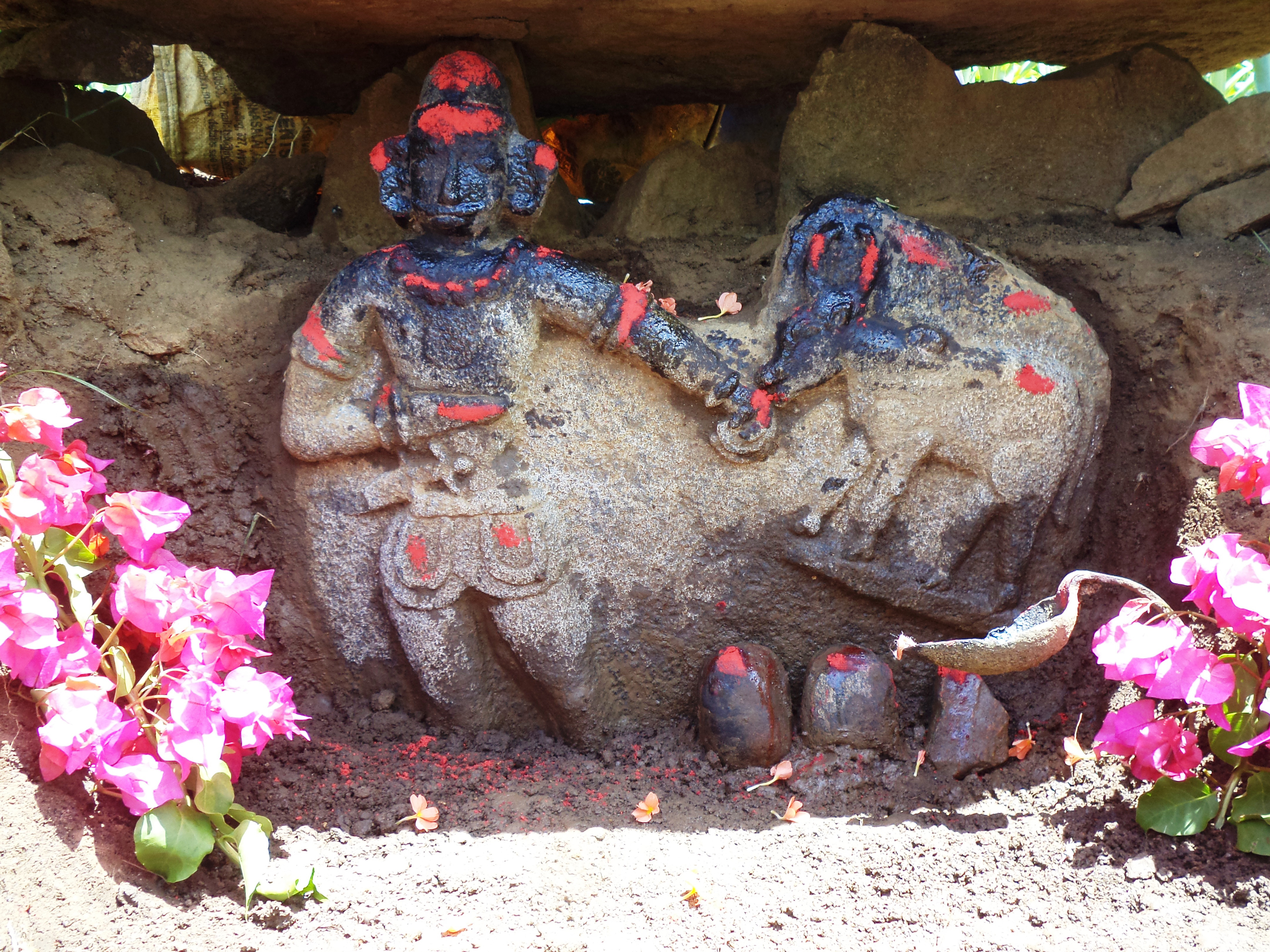 ஒரே கல்லில் வீரனின் சிற்பமும், காட்டு எருதின் சிற்பமும் செதுக்கப்பட்டுள்ளது. இதில் வீரனின் தலையில் போர் கவசம் மார்பில் பெரிய பட்டையுடைய ஆபரணமும், கை மணிக்கட்டில் ஒரு வளையமும், மேல் கையில் இரண்டு வளையங்கள், இடுப்பில் வாளுடன் கூடிய கச்சையும், போர் உடை உடுத்தியது போன்று வீரனின் உருவம் செதுக்கப்பட்டுள்ளது.