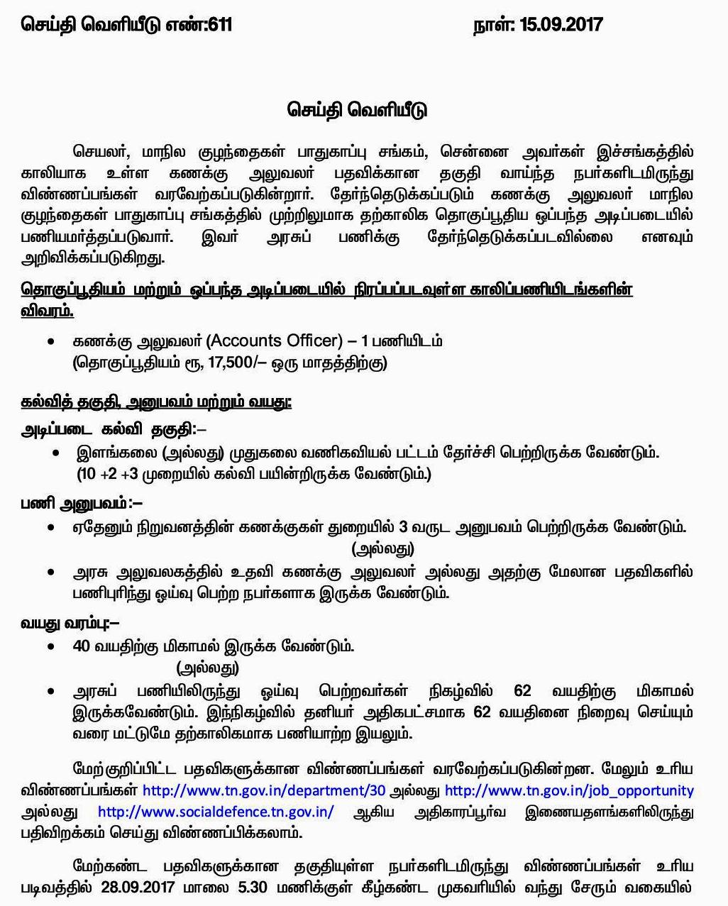 Home|News|மாநில குழந்தைகள் பாதுகாப்பு சங்கத்தில் கணக்கு அலுவலர் பணிக்கு விண்ணப்பங்கள் வரவேற்கப்படுகின்றன. -ஆர்.மார்ஷல்.