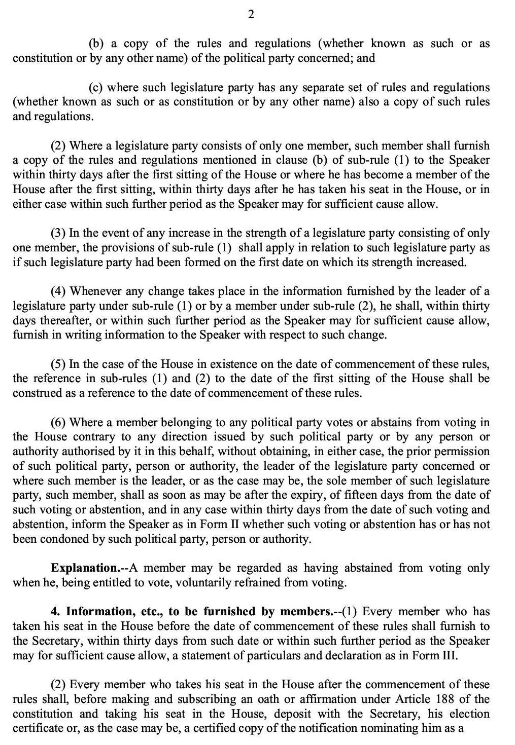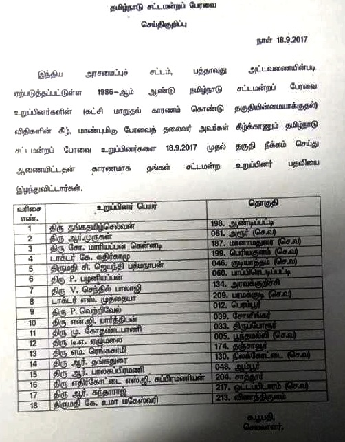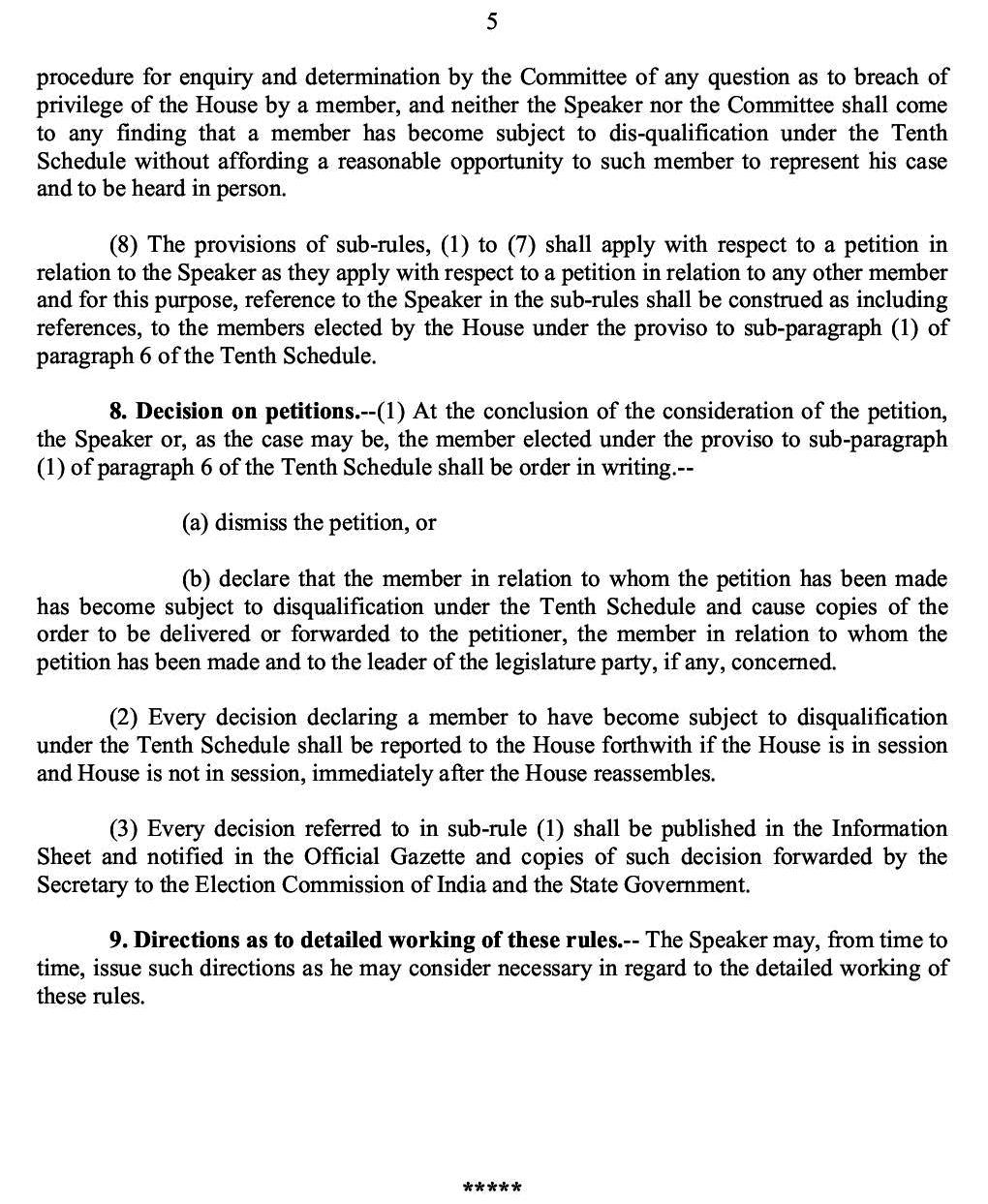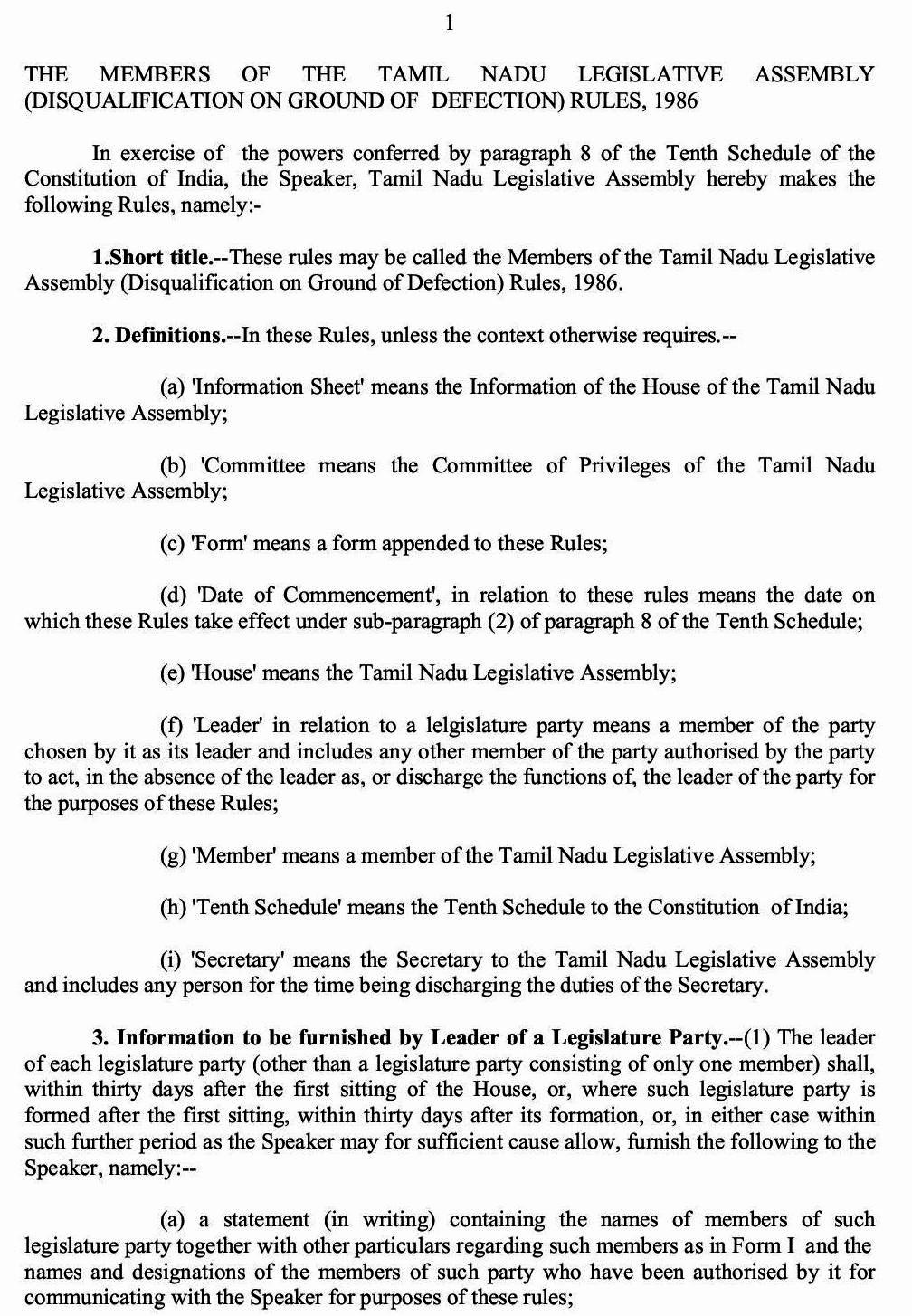 சட்டப் பேரவை உறுப்பினர்களின் தகுதி நீக்கம் குறித்து, இந்திய அரசமைப்புச் சட்டம், பத்தாவது அட்டவணையின்படி ஏற்படுத்தப்பட்டுள்ள 1986-ஆம் ஆண்டு தமிழ்நாடு சட்டமன்றப் பேரவை உறுப்பினர்களின் விதி என்ன சொல்கிறது?- இதோ நமது வாசகர்களின் பார்வைக்காக அதை இங்கே நாம் பதிவு செய்துள்ளோம்.