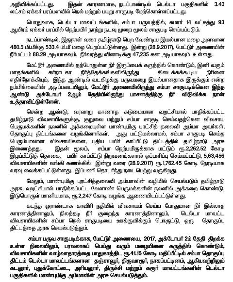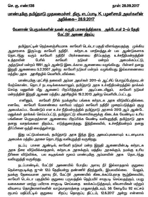 Home|News|பாசனத்திற்காக அக்டோபர் 2-ம் தேதி மேட்டூர் அணை திறப்பு: தமிழ்நாடு முதலமைச்சர் கே.பழனிசாமி அறிக்கை! -முழு விபரம். -ஆர்.அருண்கேசவன்.