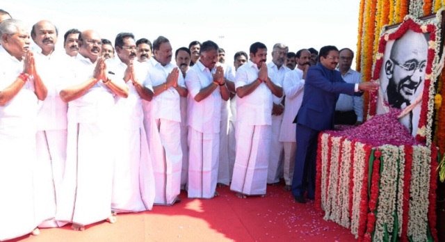மகாத்மா காந்தி 149-வது பிறந்த நாளை முன்னிட்டு, சென்னை மெரினா கடற்கரையில் உள்ள மகாத்மா காந்தி சிலைக்கு அருகே, தமிழக ஆளுநர் வித்யாசாகர் ராவ், தமிழக முதலமைச்சர் கே.பழனிசாமி, துணை முதலமைச்சர் ஓ.பன்னீர்செல்வம் மற்றும் அமைச்சர்கள், மகாத்மா காந்தியின் திருஉருவபடத்திற்கு மலர் தூவி மரியாதை செலுத்தினர்.