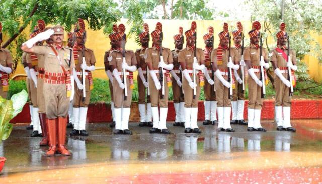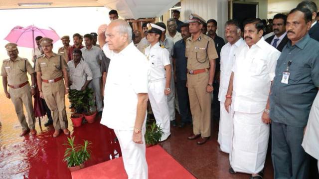 கொட்டும் மழையையும் பொருட்படுத்தாது புதிய ஆளுநருக்கு, வீரர்கள் அணிவகுப்பு மரியாதை அளித்தனர். அதனை ஆளுநர் பன்வாரிலால் புரோஹித் ஏற்றுக்கொண்டார்.