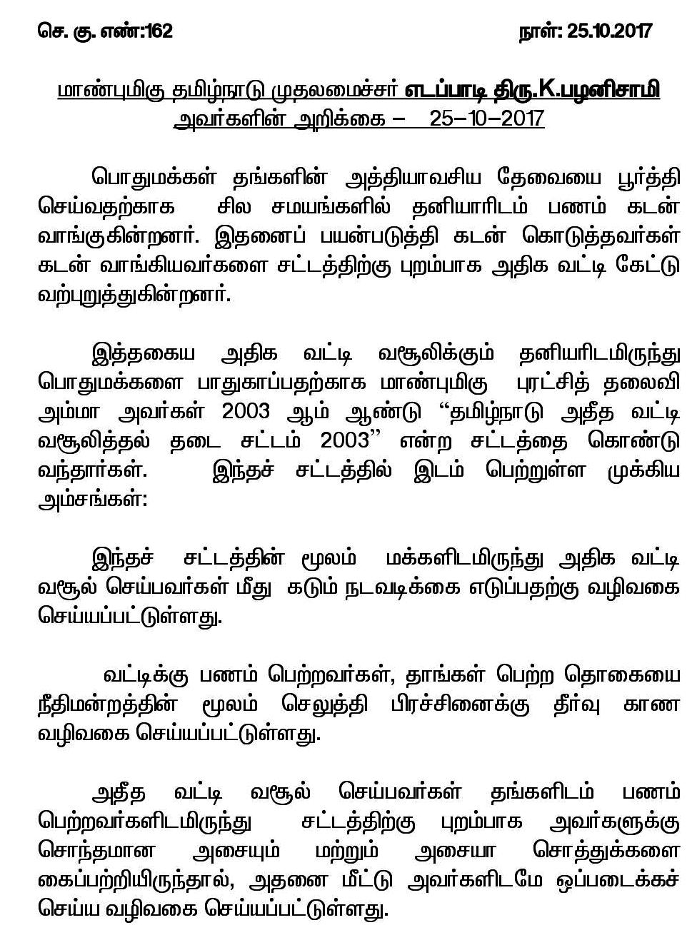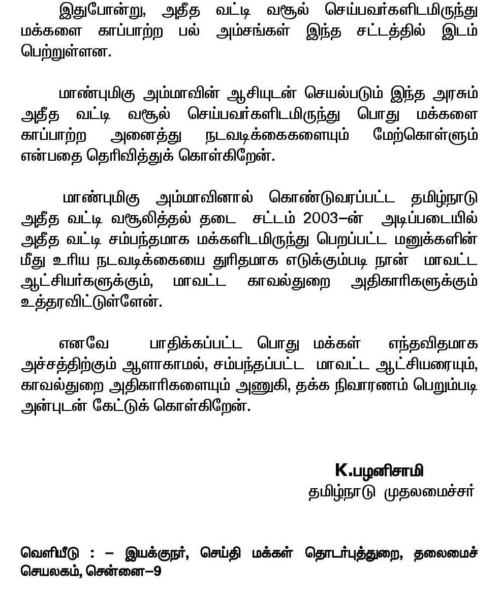 கந்து வட்டி வசூலிப்பவர்கள் மீது கடும் நடவடிக்கை எடுக்க, மாவட்ட ஆட்சியர் மற்றும் காவல்துறை அதிகாரிகளுக்கு, தமிழக முதலமைச்சர் கே.பழனிச்சாமி உத்தரவு.