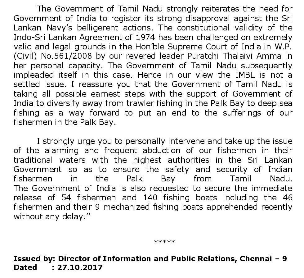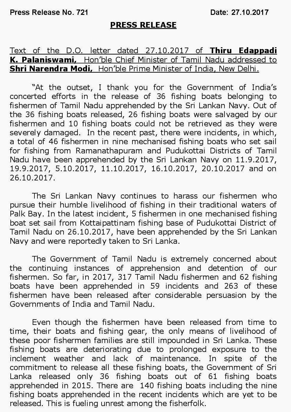 இதுக்குறித்து பிரதமர் நரேந்திர மோதிக்கு, தமிழ்நாடு முதலமைச்சர் கே.பழனிசாமி இன்று (27.10.2017) கடிதம் எழுதியுள்ளார்.