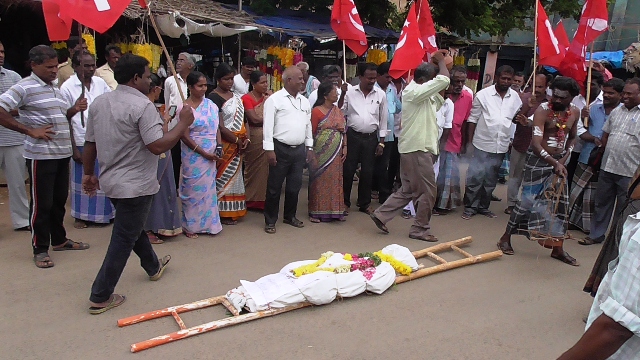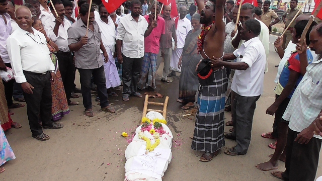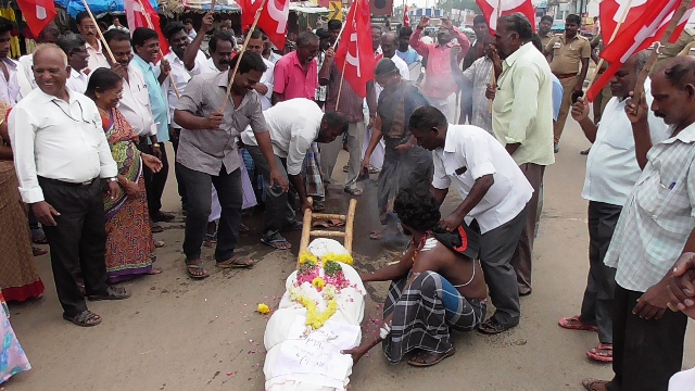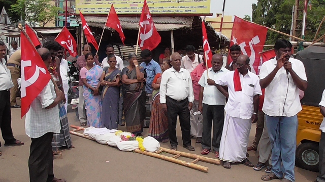 திருச்சி, திருவெறும்பூர் மற்றும் அரியமங்கலம் ரயில்வே மேம்பாலத்திற்கு பக்கவாட்டில், இருபுறமும் உள்ள அணுகு சாலைகள் அமைக்காமல், கடந்த 15 ஆண்டுகளுக்கு மேலாக கிடப்பில் போட்டுள்ளதைக் கண்டித்து, மார்க்சிஸ்ட் கம்யூனிஸ்ட் கட்சியின் சார்பில், பாடைகட்டி கொல்லி சட்டியுடன் சவ ஊர்வலம் நடத்தினர்.