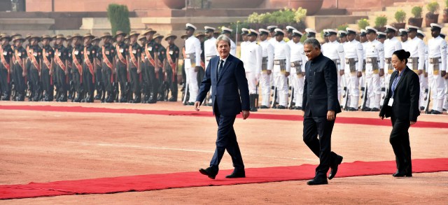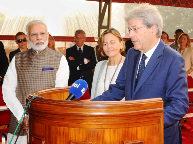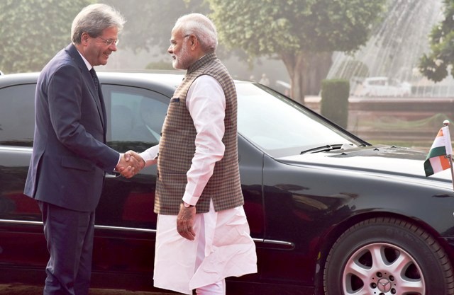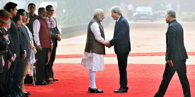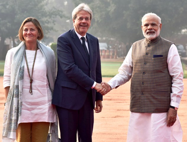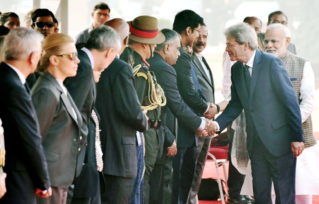 இத்தாலி நாட்டு பிரதமர் பாலோ ஜென்டிலோனிக்கு இந்தியாவின் சார்பில் சிகப்பு கம்பள வரவேற்பும், ராணுவ அணிவகுப்பு மரியாதையும் அளிக்கப்பட்டது.