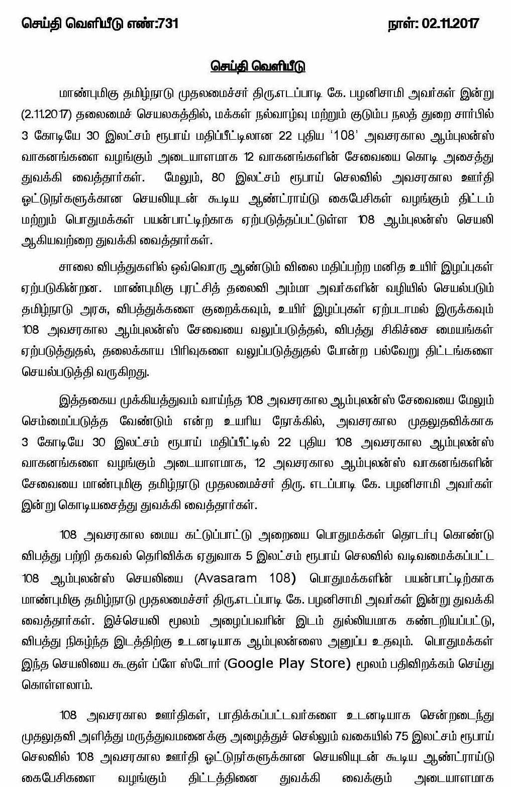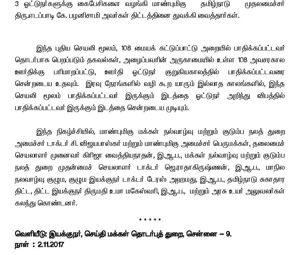 Home|News|புதிய 108 அவசரகால ஆம்புலன்ஸ் வாகனங்களின் சேவையை, தமிழ்நாடு முதலமைச்சர் கே.பழனிசாமி துவக்கி வைத்தார். -ஆர்.மார்ஷல்.