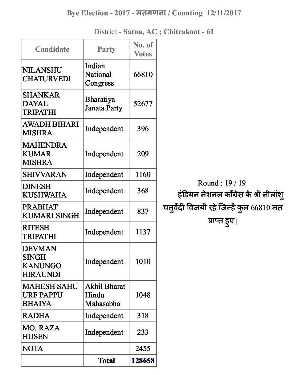 இந்நிலையில், பதிவான வாக்குகளை எண்ணும் பணி சட்னா மாவட்டத்தில் இன்று (12.11.2017) காலை 8 மணிக்கு தொடங்கியது. முதலில் இருந்தே காங்கிரஸ் வேட்பாளர் நிலான்ஷு சதுர்வேதி பா.ஜ.க. வேட்பாளர் சங்கர்லால் திரிவேதியை விட முன்னிலை வகித்து வந்தார். இறுதியில் பா.ஜ.க. வேட்பாளரை விட 14,133 வாக்குகள் கூடுதலாக பெற்று காங்கிரஸ் வேட்பாளர் நிலான்ஷு சதுர்வேதி வெற்றி பெற்றுள்ளார்.