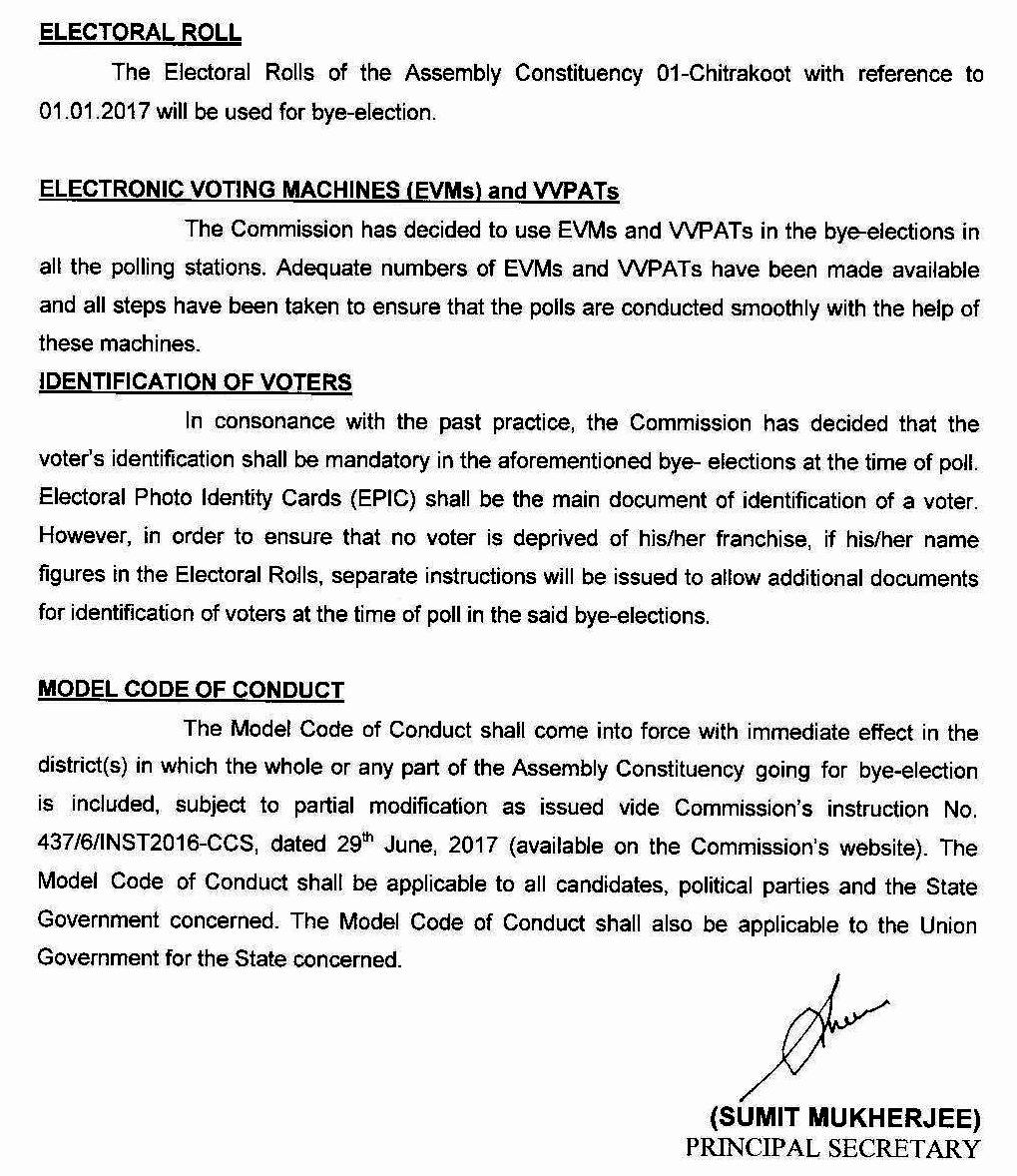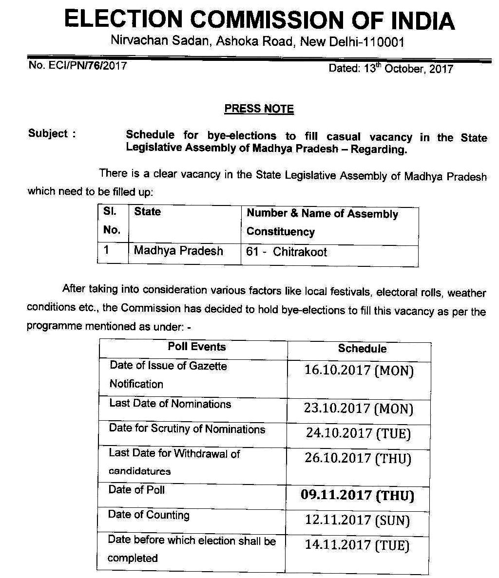 சித்ரகூட் தொகுதி சட்டப்பேரவை உறுப்பினராக இருந்த காங்கிரசை சேர்ந்த பிரேம்சிங் கடந்த மே மாதம் காலமானார். இந்நிலையில், சித்ரகூட் சட்டப்பேரவை தொகுதிக்கு நவம்பர் 9-ம் தேதி இடைத்தேர்தல் அறிவிக்கப்பட்டது.
