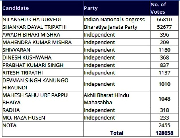 காங்கிரஸ் தரப்பில் நிலான்ஷு சதுர்வேதி, பா.ஜ.க. சார்பில் சங்கர்லால் திரிபாதி உள்பட மொத்தம் 25 பேர் வேட்பு மனு தாக்கல் செய்தனர். இதில் 2 பேர் வேட்பு மனுவை வாபஸ் பெற்றனர். 11 நபர்களின் வேட்பு மனுக்கள் தேர்தல் ஆணையத்தால் தள்ளுபடி செய்யப்பட்டன. இறுதியாக 12 பேர் தேர்தலில் போட்டியிட்டனர். ஆனால், காங்கிரஸ், பா.ஜ.க. இடையே தான் போட்டி பலமாக இருந்தது.