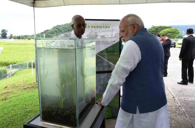 மழை மற்றும் வெள்ளப்பெருக்கு ஏற்படும் தருணங்களில், 14 முதல் 18 நாட்கள் நெற்பயிர்கள் நீரில் மூழ்கி இருந்தாலும், எந்த சேதமும் ஏற்படாமல் நல்ல விளைச்சலை தரக்கூடிய நெல்வகைகள் பற்றி, இந்திய பிரதமர் நரேந்திர மோதிக்கு, அங்குள்ள விஞ்ஞானிகள் எடுத்துரைத்தனர்.