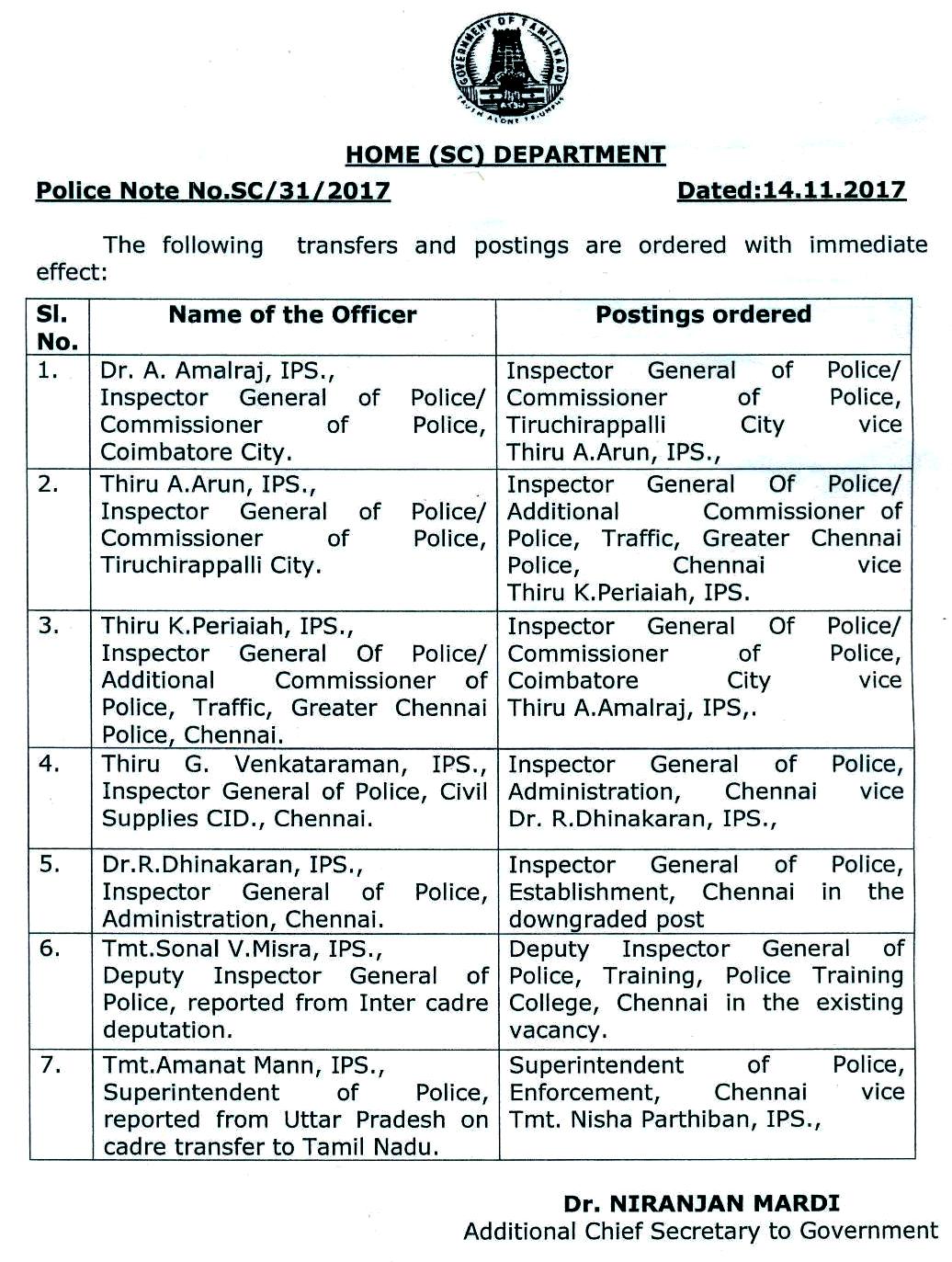 காவல் துறை பொது விநியோக துறையில் ஐ.ஜி.,யாக இருக்கும் வெங்கட்ராமன் நிர்வாகதுறை ஐ.ஜி.,யாகவும், நிர்வாக பிரிவில் ஐ.ஜி.,யாக இருக்கும் தினகரன் ஸ்தாபன ஐ.ஜி.,யாகவும், சென்னை பயிற்சி கல்லூரி ஐ.ஜி.,யாக சோனல்மிஸ்ராவும், அமலாக்கத்துறை கண்காணிப்பாளராக அமானத்தும் மாற்றப்பட்டுள்ளனர்.