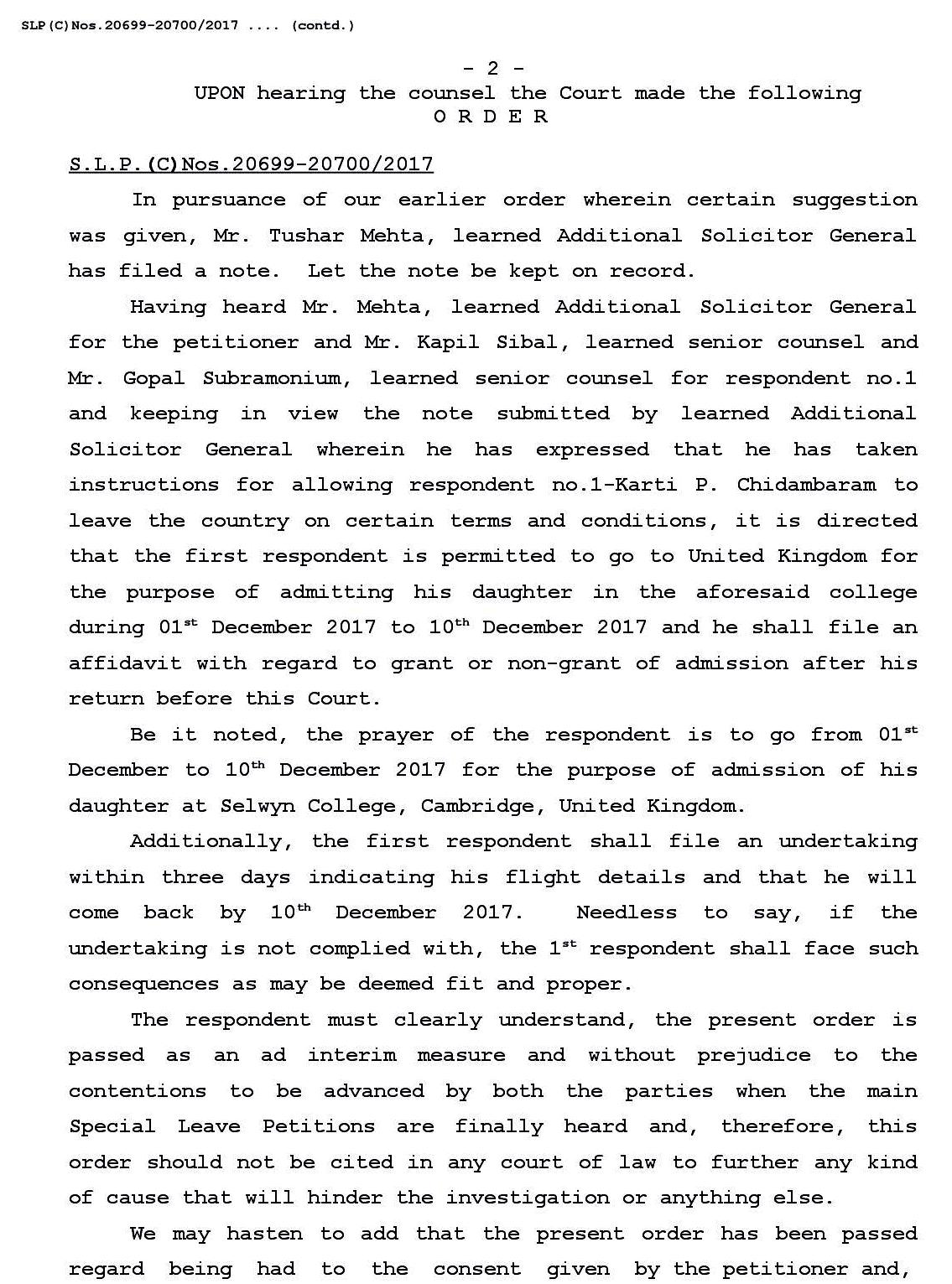 இதனையடுத்து, டிசம்பர் 1- ம் தேதி சென்றுவிட்டு டிசம்பர் 10- தேதிக்குள் இந்தியா திரும்பி விட வேண்டும் என்ற சில நிபந்தனைகளுடன், கார்த்தி சிதம்பரத்திற்கு உச்ச நீதிமன்றம் அனுமதி அளித்து இன்று உத்தரவு பிறப்பித்துள்ளது.