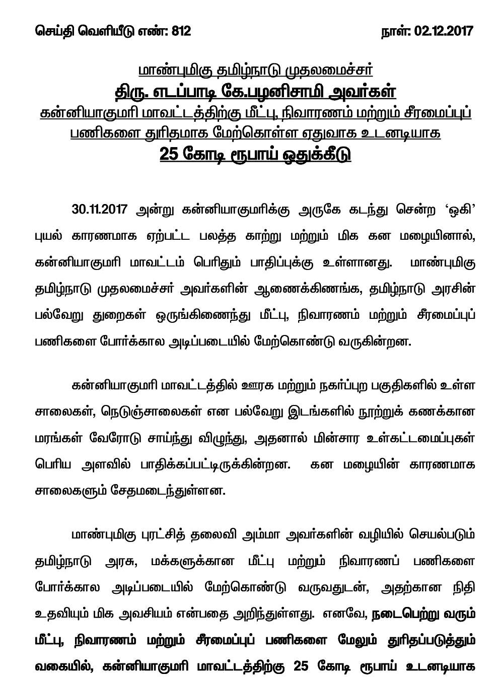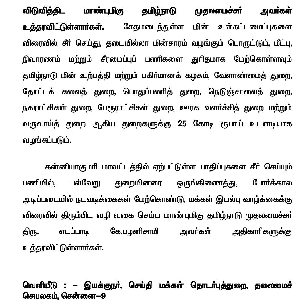 மீட்பு, நிவாரணம் மற்றும் சீரமைப்புப் பணிகளை துரிதமாக மேற்கொள்ள கன்னியாகுமரி மாவட்டத்திற்கு 25 கோடி ரூபாய் ஒதுக்கீடு: தமிழ்நாடு முதலமைச்சர் கே.பழனிசாமி உத்தரவு