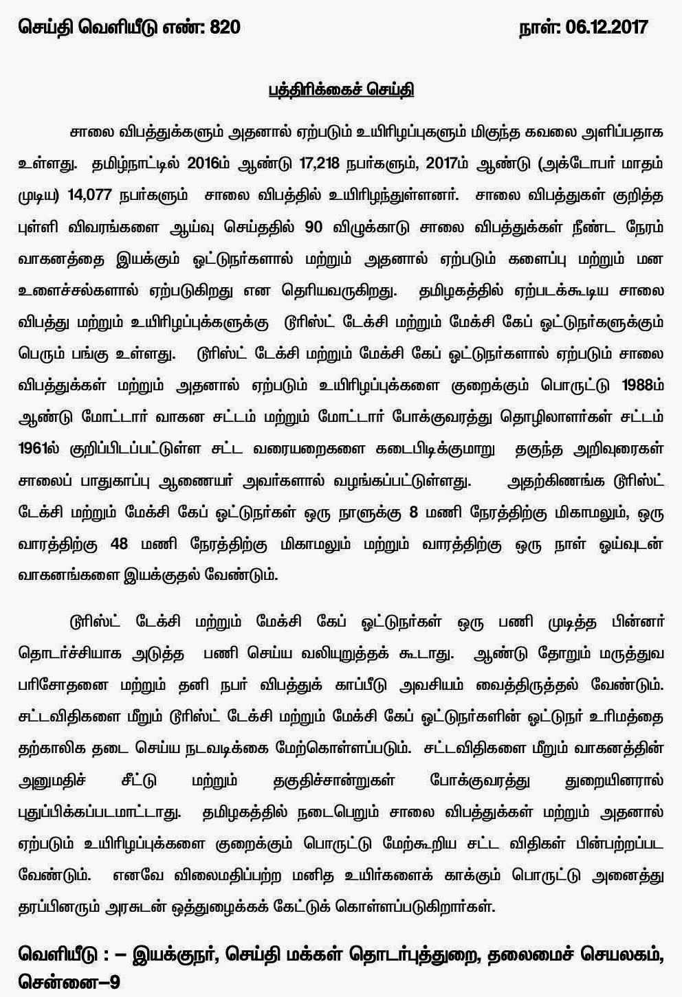Home|News|டூரிஸ்ட் டேக்சி மற்றும் மேக்சி கேப் ஓட்டுநர்கள் ஒரு நாளைக்கு 8 மணி நேரம் மட்டும்தான் வாகனங்களை இயக்க வேண்டும்!- தமிழக அரசு உத்தரவு. -எஸ்.திவ்யா.