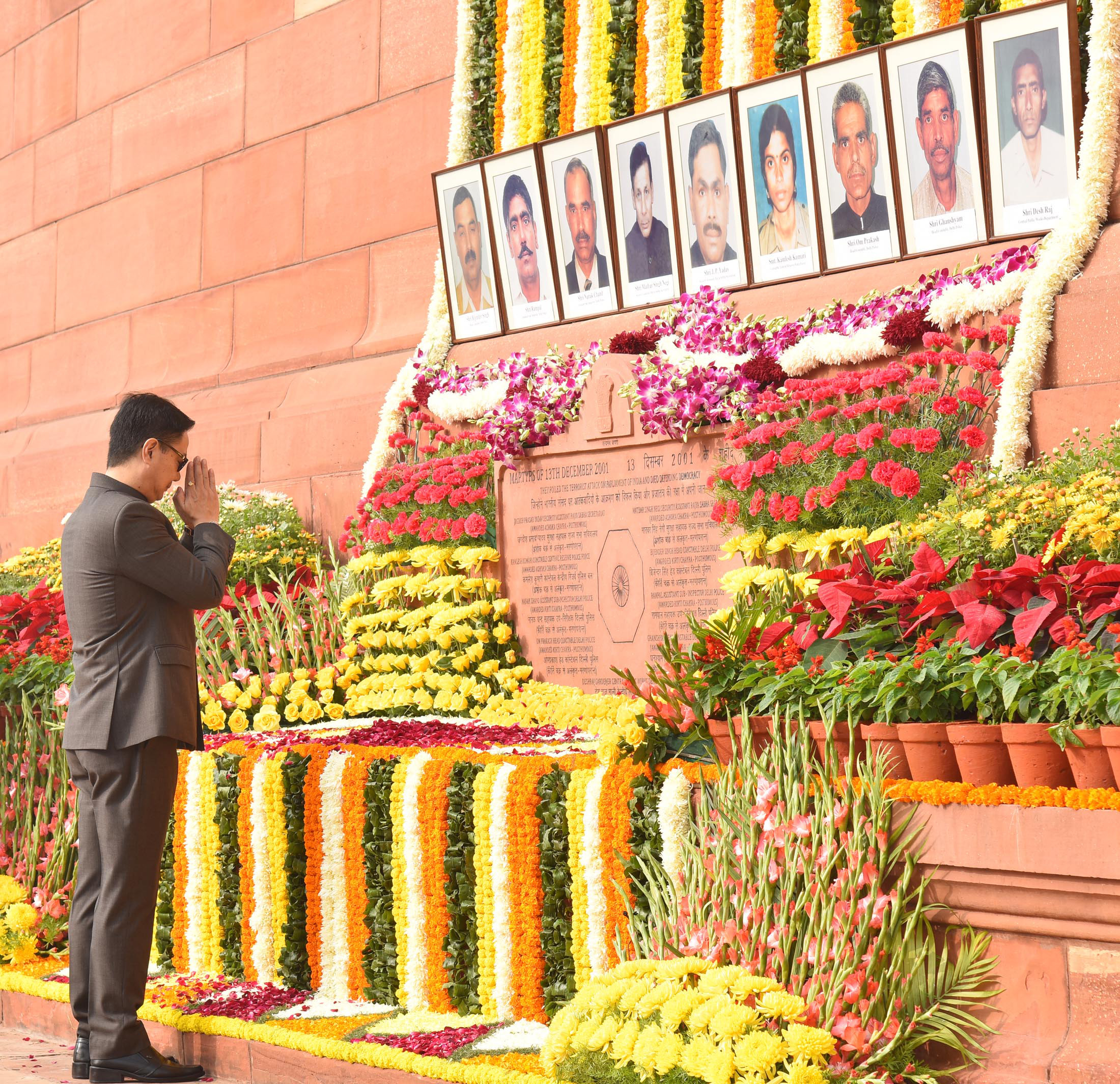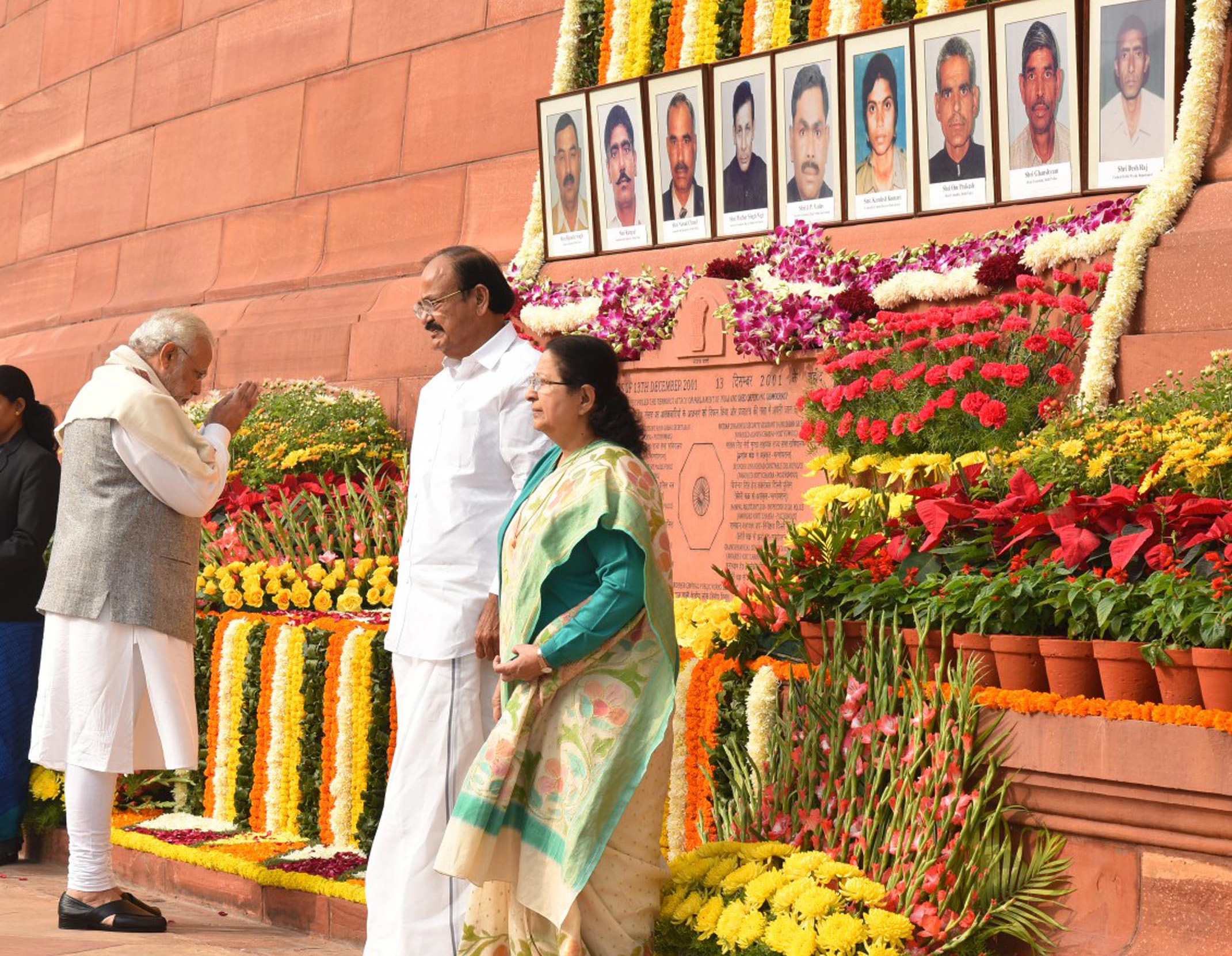 இந்த சம்பவத்தின்போது தீவிரவாதிகளை எதிர்த்து போரிட்டதில் பாதுகாப்புபடை வீரர்கள் 8 பேர் வீரமரணம் அடைந்தனர். தோட்டப்பணியில் ஈடுபட்டிருந்த ஒருவரும் உயிரிழந்தார். இந்த தாக்குதல் சம்பவத்தின் 16 -வது ஆண்டு நினைவுதினம் இன்று அனுசரிக்கப்பட்டது. இதையொட்டி பாராளுமன்ற வளாகத்தில் மேற்கண்ட 9 பேரின் புகைப்படங்களும் வைக்கப்பட்டு மலர் அஞ்சலி செலுத்தும் நிகழ்ச்சி நடைப்பெற்றது.