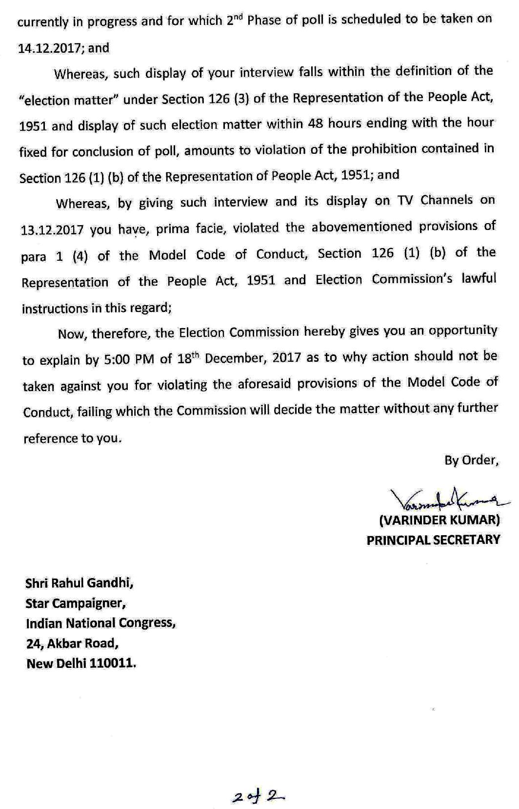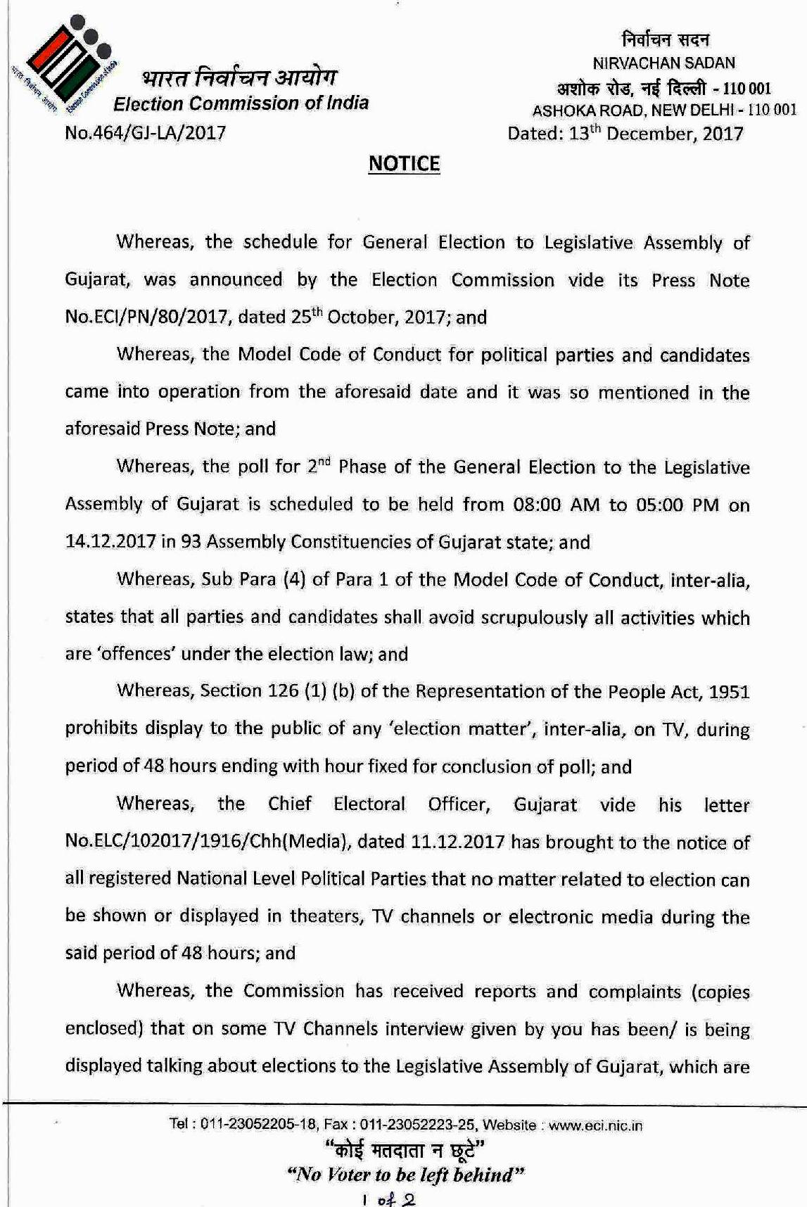 ராகுல் காந்தி பேட்டியை ஒளிபரப்பு செய்த தொலைக்காட்சி நிறுவனங்கள் மீது வழக்கு!- ராகுல் காந்திக்கு இந்திய தேர்தல் ஆணையம் நோட்டீஸ்! -உத்தரவின் உண்மை நகல்.