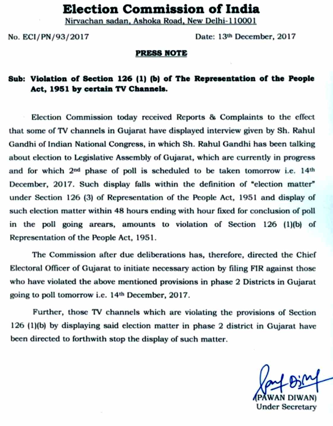 இதன் அடிப்படையில் ராகுல் காந்தி பேட்டியை ஒளிபரப்பு செய்த தொலைக்காட்சி நிறுவனங்கள் மீது வழக்குப்பதிவு செய்ய, இந்திய தேர்தல் ஆணையம் உத்தரவிட்டுள்ளது.