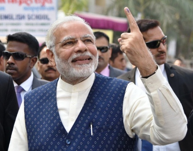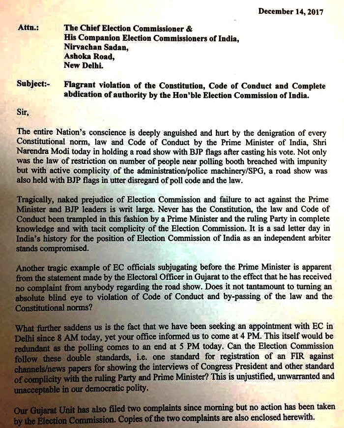 பிரதமர் நரேந்திரமோதி சபர்மதியில் உள்ள ராணிப் என்ற இடத்தில் அமைந்துள்ள ஓட்டுச்சாவடியில், வரிசையில் நின்று ஓட்டு போட்டார். பின்னர் வெளியே வந்த அவர், தனது வாகனத்தில் கிளம்பி சென்றார். நடந்து சென்ற போது, அங்கிருந்த வாக்காளர்களை நோக்கி தனது கைவிரல்களை காட்டி சென்றார். இது தேர்தல் விதிமுறைகளை மீறிய செயல் என புகார் கூறியுள்ள காங்கிரஸ் கட்சி, தேர்தல் ஆணையம் தனது பணியை செய்யாமல் தூங்கி கொண்டிருப்பதுடன், பா.ஜ.க. அரசின் கைப்பாவையாக செயல்படுவதாக கூறியுள்ளது.