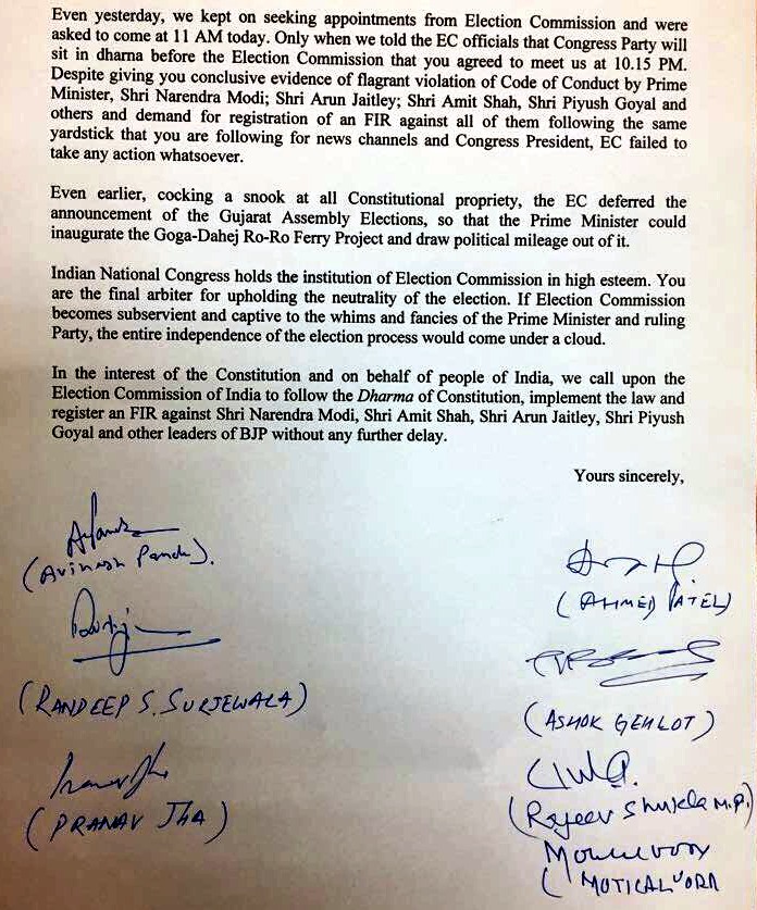 மேலும், தேர்தல் விதிகளை மீறிய பிரதமர் நரேந்திரமோதி, மத்திய நிதி அமைச்சர் அருண் ஜேட்லி, பா.ஜ.க. தேசிய தலைவர் அமித்ஷா ஆகியோர் மீது வழக்கு பதிவு செய்து நடவடிக்கை எடுக்குமாறு, இந்திய தேர்தல் ஆணையரிடம் காங்கிரஸ் கட்சியின் சார்பில் புகார் அளித்துள்ளனர்.